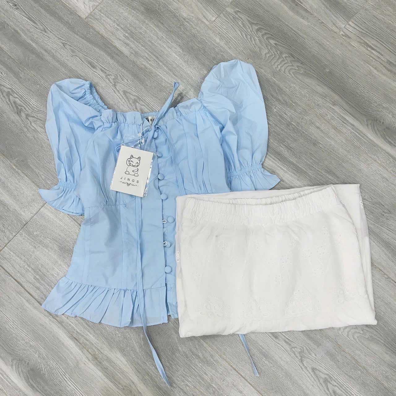 ✨Set Áo Cổ Vuông Xanh Cúc Bọc Tay Bồng Phối Chân Váy Trắng