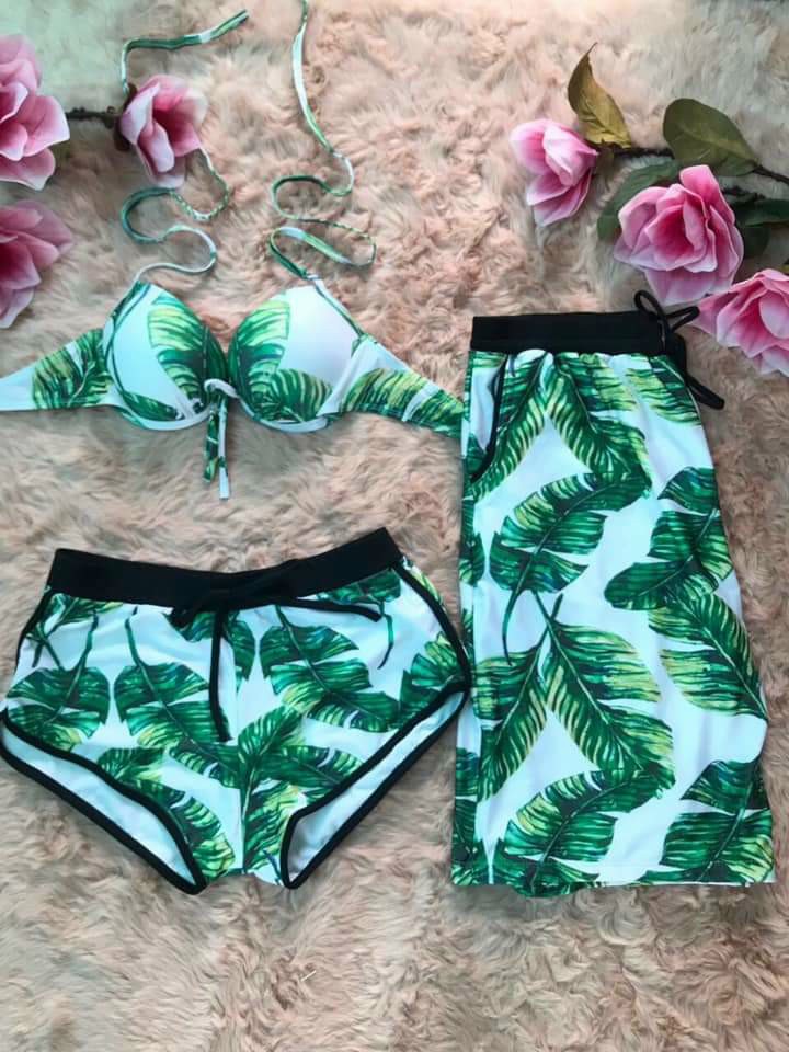 Bikini, đồ bơi nữ đi biển set 3 món hai mảnh họa tiết hoa kèm khăn quấn