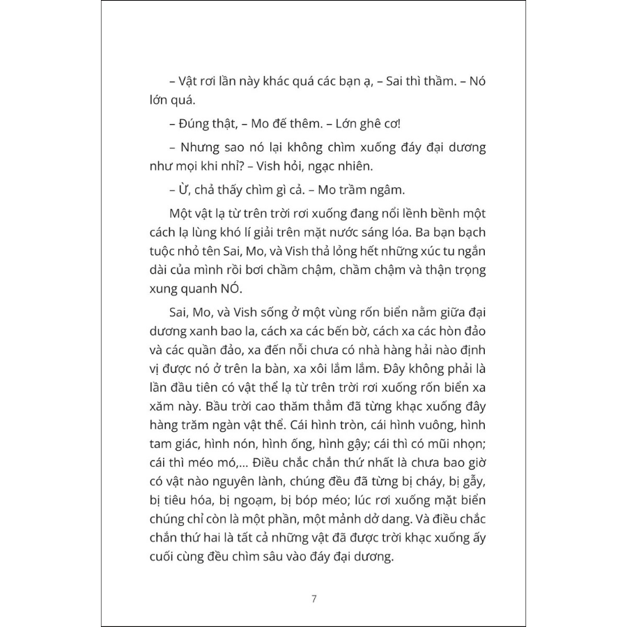 Mo, Sai, và Vish, ba bạn bạch tuộc nhỏ sinh sống ở vùng này cũng đã từng nhìn thấy rất nhiều vật lạ, vật nhọn, vật tròn, hàng núi vật thể bằng nhựa, to nhỏ dài méo, rồi cả nham thạch… từ trên trời rơi xuống. Nhưng một vật như thế này thì chưa từng thấy bao giờ.