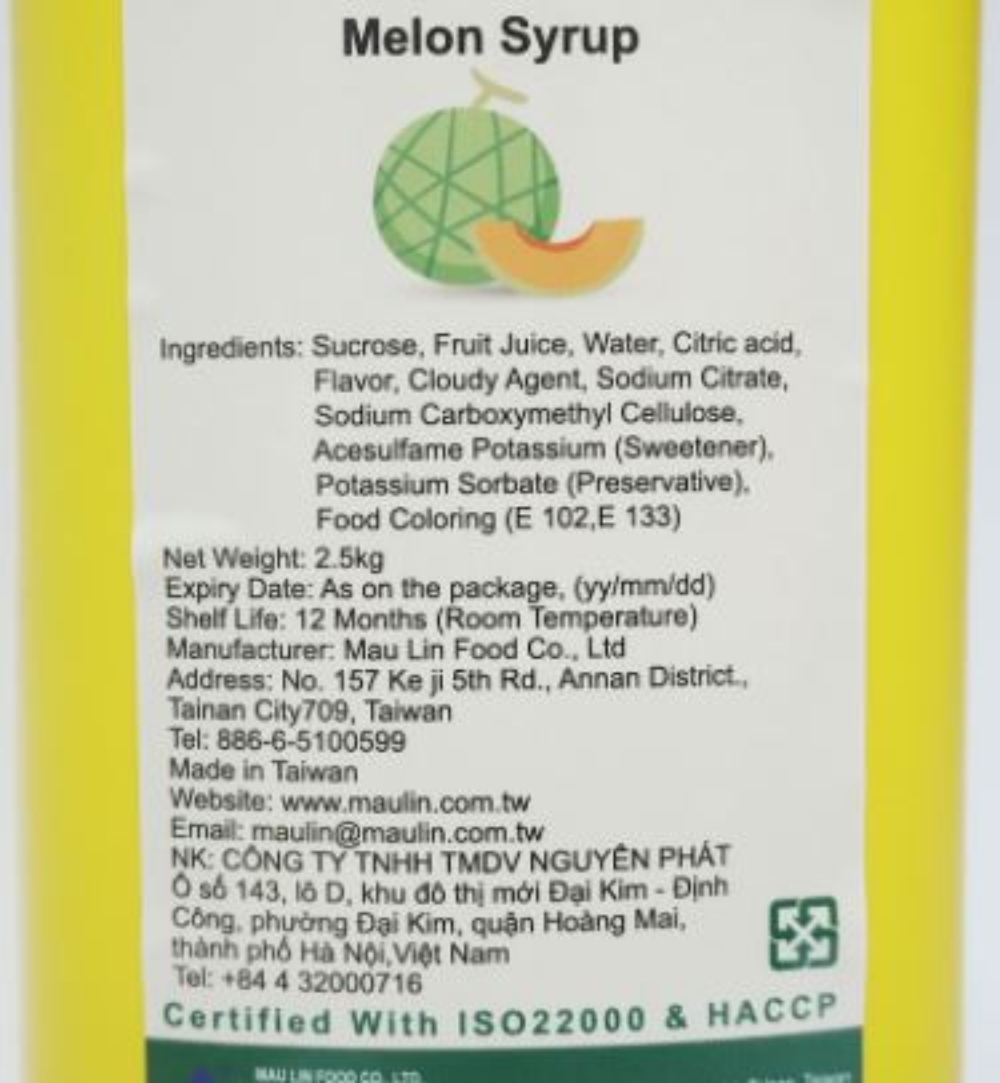 Mua tại TiktokSiro Dưa Lưới MauLin (MauLin Melon Syrup) Can 2.5Kg Siro Dưa Lưới Maulin được nhiều khách hàng đặc biệt ưa dùng vì có hương thơm và vị trái cây mạnh, tạo mùi tốt. Thành phần siro dưa lưới Thành phần: Nước ép dưa lưới, đường, chất điều chỉnh độ acid: axit citric, chất bảo quản, sulphur dioxide, màu thực phẩm tự nhiên và tổng hợp, hương thực phẩm tổng hợp Ứng dụng của siro Dưa Lưới Siro Dưa Lưới Maulin có thể được sử dụng để pha chế: trà sữa, trà hoa quả. Hơn nữa loại siro này cũng được sử dụng nhiều để pha sinh tố hoa quả hoặc soda. Bạn hoàn toàn có thể pha trực tiếp với nước để uống loại syrup này. Quy cách đóng gói và bảo quản