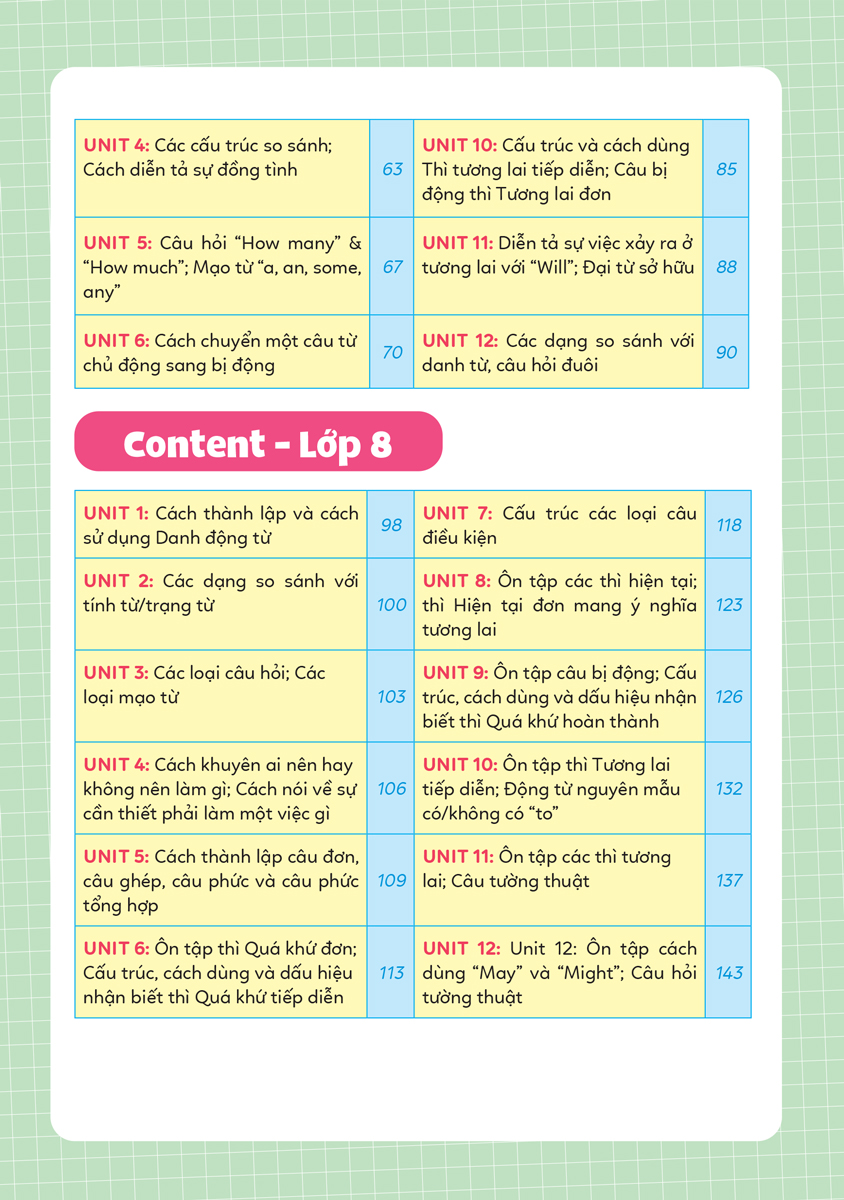 - Sách hệ thống các kiến thức trọng tâm của chương trình học Cuốn sách bám sát khung chương trình Tiếng Anh Trung học cơ sở của Bộ Giáo dục và Đào tạo chia làm các chủ đề tương ứng với chương trình học tiếng Anh của ,, , Cuốn sách giới thiệu các cấu trúc ngữ pháp tiếng Anh một cách ngắn gọn, trọng tâm, có kèm ví dụ minh họa cụ thể giúp các em dễ dàng ghi nhớ và vận dụng.