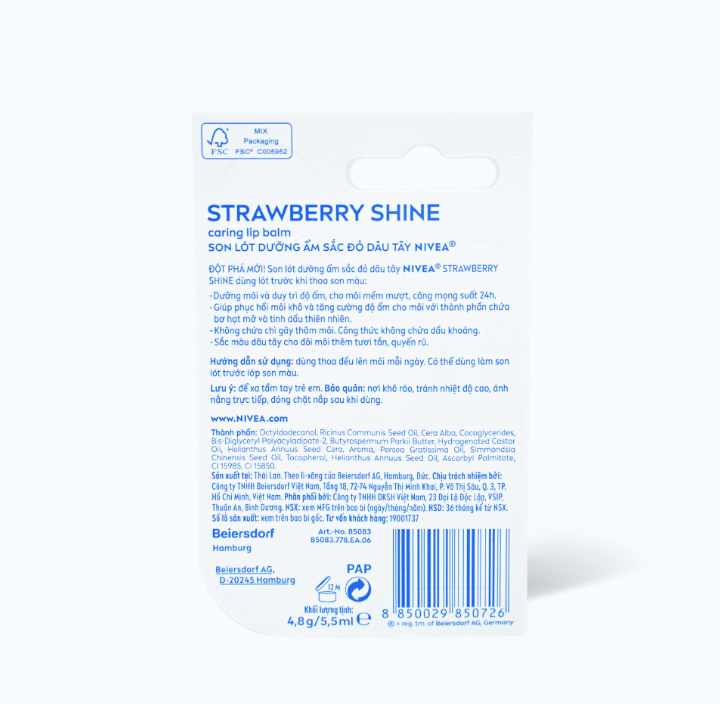 Mua tại TiktokThành phần Ricinus Communis Seed Oil, Polyisobutene, Octyldodecanol, Pentaerythrityl Tetraisostearate, Hydrogenated Polydecene, Candelilla Cera, Butyrospermum Parkii Butter, Cera M Công dụng Son dưỡng ẩm dùng cho môi. Giúp dưỡng môi và trang điểm cho khuôn mặt. Cách sử dụng Thoa trực tiếp lên môi, điều chỉnh lượng son môi phù hợp với nhu cầu và sắc thái môi. Thích hợp với bốn mùa trong năm. Bảo quản: Nơi khô ráo, thoáng mát và tránh nhiệt độ cao. Trọng lượng: 4.8g Xuất xứ thương hiệu: Đức Thương hiệu: Nivea Sản xuất tại: Beiersdorf (Thái Lan)