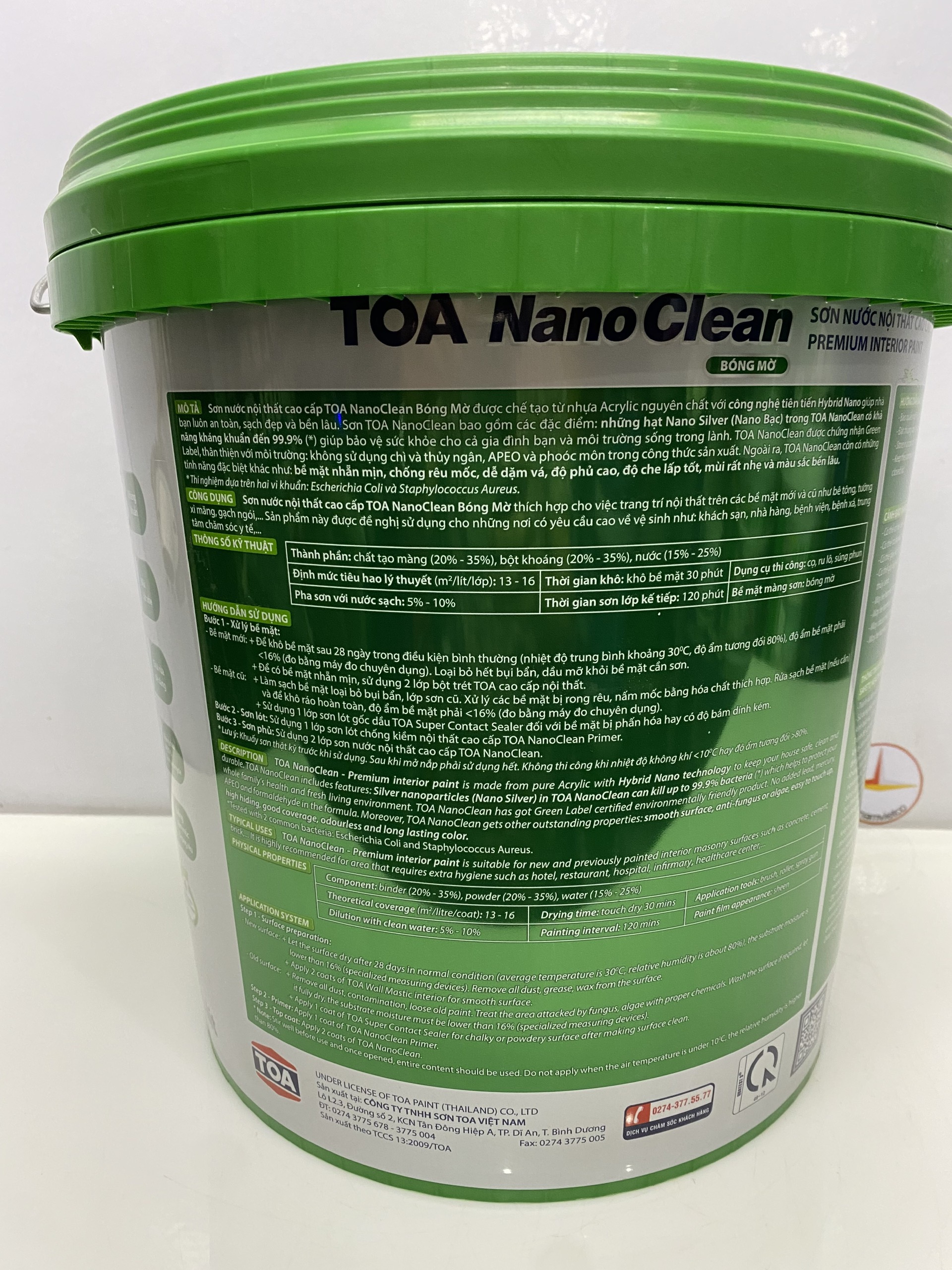 - Được chế tạo từ nhựa acrylic nguyên chất với công nghệ tiên tiến nano giúp nhà bạn luôn an toàn, sạch sẽ và bền lâu. - Những hạt Nano Silver (Nano Bạc) trong TOA NanoClean có khả năng kháng khuẩn đến 99,9%(*) giúp bảo vệ sức khỏe cho gia đình bạn và môi trường trong lành. - TOA NanoClean được chứng nhận là sản phẩm xanh, thân thiện với môi trường, không sử dụng chì, APEO và phoóc-môn trong công thức sản xuất. - Ngoài ra, TOA NanoClean còn có những tính năng đặc biệt khác như: bề mặt nhẵn mịn, chống rêu mốc, dễ dặm vá, độ phủ cao, độ che lấp tốt, mùi rất nhẹ, dễ chịu và màu sắc bền lâu.