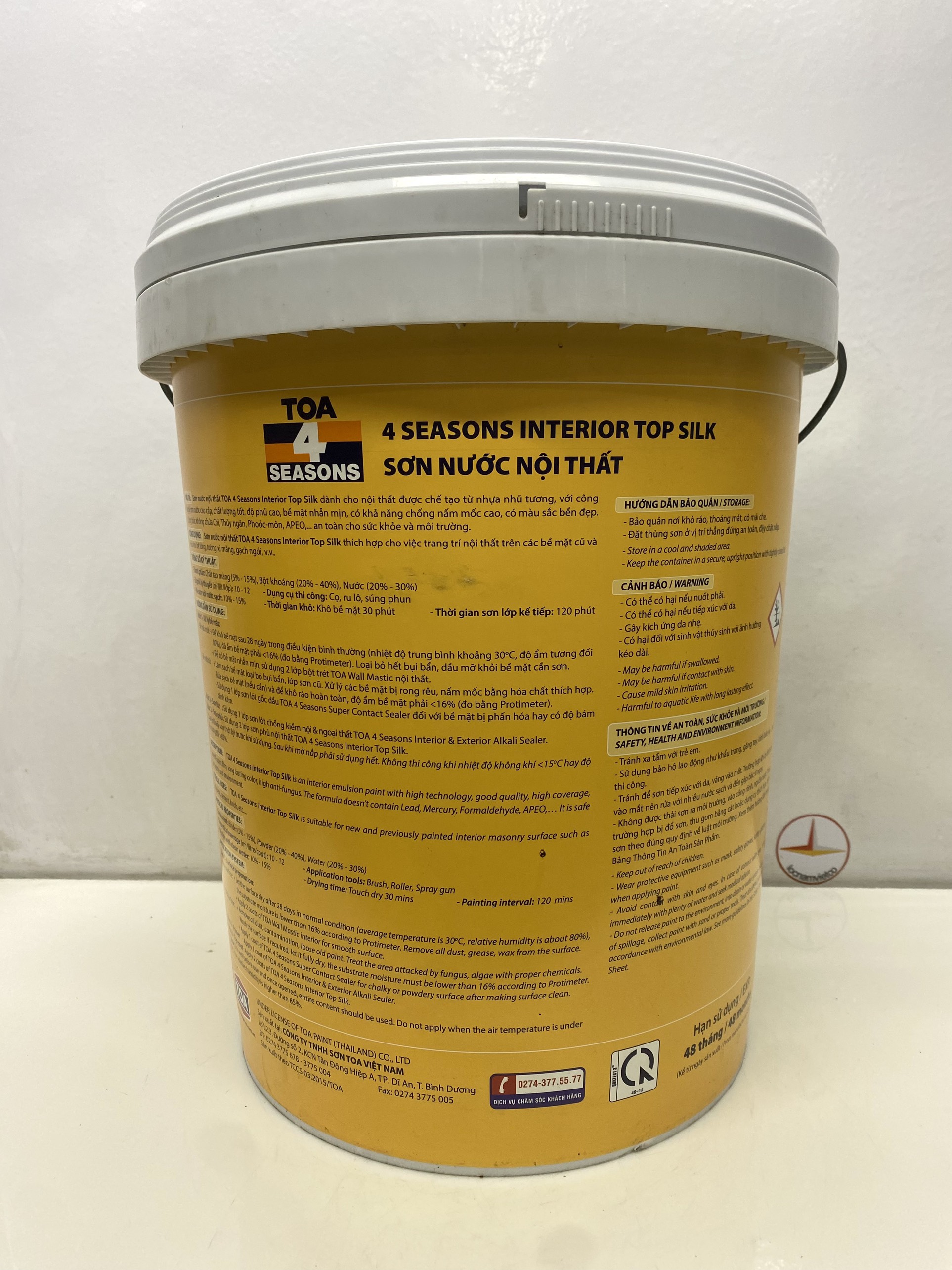 Sử dụng 1 lớp sơn lót đa năng cao cấp TOA Hydro Quick Primer đối với bề mặt bị phấn hóa hay có độ bám dính kém. Bước 2 - Sơn lót: Sử dụng 1 lớp sơn lót chống kiềm nội thất 4 Seasons Sealer Bước 3 - Sơn phủ: Sử dụng 2 lớp sơn nước nội thất Toa 4 Seasons Top Silk. *Lưu ý: Khuấy sơn thật kỹ trước khi sử dụng. Sau khi mở nắp phải sử dụng hết. Thi công trong khoảng nhiệt độ từ 10°C đến 35°C và độ ẩm tương đối dưới 75%. Nhận giao hàng: Vũng Tàu, Bình Dương, Bình Phước, Long An, Đồng Nai, TP.HCM gửi hàng đi Toàn Quốc giá rẻ.
