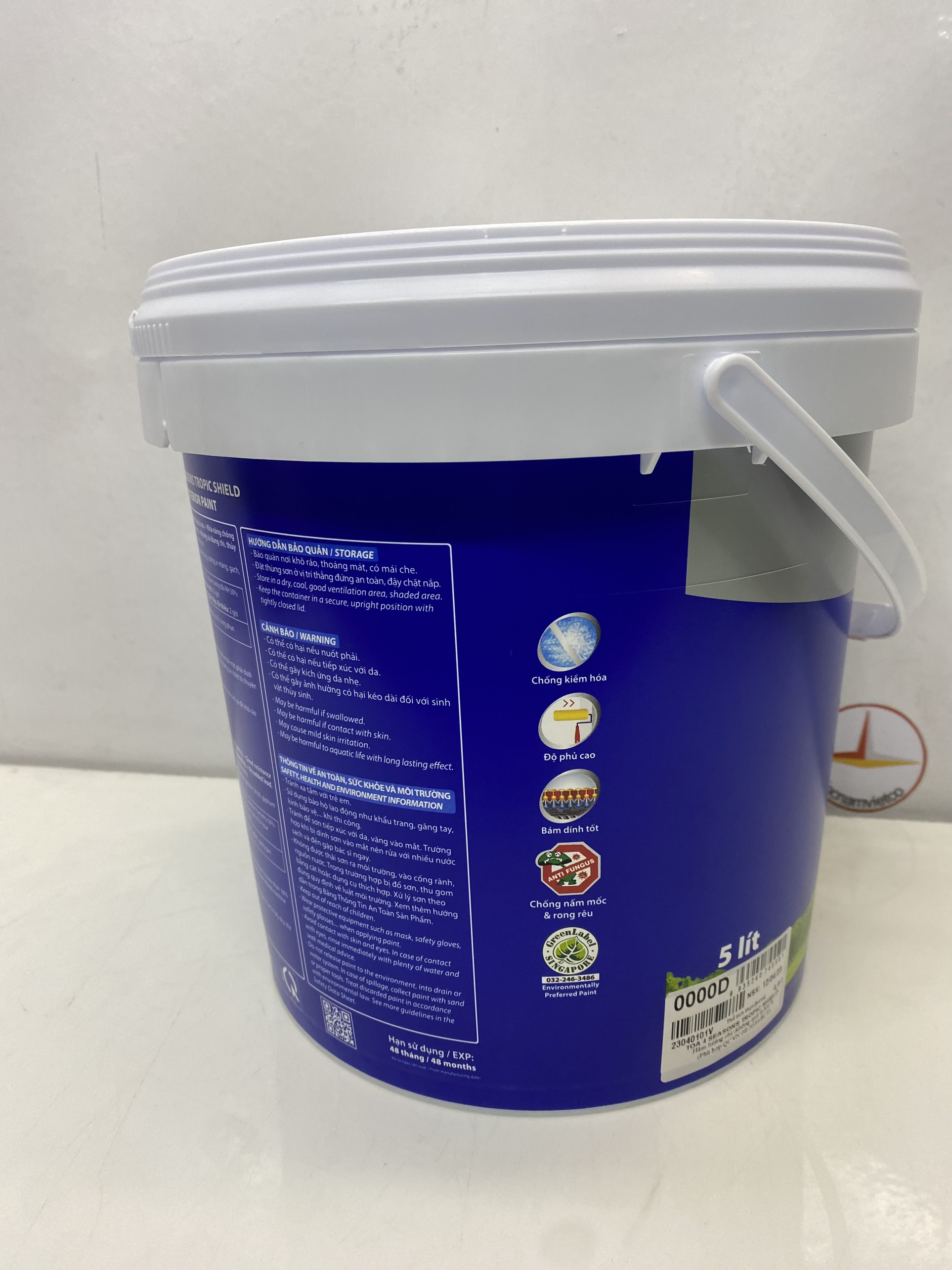 Chứng nhận Green label  MỤC ĐÍCH SỬ DỤNG: Sơn Nước Toangoại thất TOA 4 Seasons Tropic Shield thích hợp cho việc trang trí nội thất trên các bề mặt mới và cũ như bê tông, tường xi măng, bê tông, thạch cao, gạch, ngói, tấm xi măng nhẹ, v.v...  ĐẶC TÍNH SẢN PHẨM: · Thành phần cấu tạo: Chất tạo màng, Bột khoáng, Nước. · Màu sắc: Nhiều màu Theo bảng màu và quạt màu TOA · Bề mặt hoàn thiện: Mờ · Thể tích chất rắn: 37 ± 2 (% theo thể tích) · Độ phủ lý thuyết: 9 – 12 m2/lít/lớp Độ phủ thực tế sẽ phụ thuộc vào khả năng dàn trải của màng sơn, độ dày màng sơn khô, bề mặt thi công, tay nghề thợ sơn và lượng sơn hao hụt thực tế khi thi công. ·Hàm lượng chất hữu cơ bay hơi (VOCs): ≤ 50 g/l  Thời gian khô ở nhiệt độ 30 oC: khô bề mặt 30 phút ; khô cứng:4h  Đóng gói: 18 lít; 5 lít, 1lít Dụng cụ: Cọ, ru-lô/con lăn, súng phun sơn thông thường Tỷ lệ pha loãng:Sơn sẵn sàng sử dụng sau khi được khuấy trộn đồng nhất. Nếu có nhu cầu pha loãng, chỉ nên pha tối đa 5% với nước ngọt sạch. HƯỚNG DẪN THI CÔNG: Bước 1:  Xử lý bề mặt: Bề mặt mới: