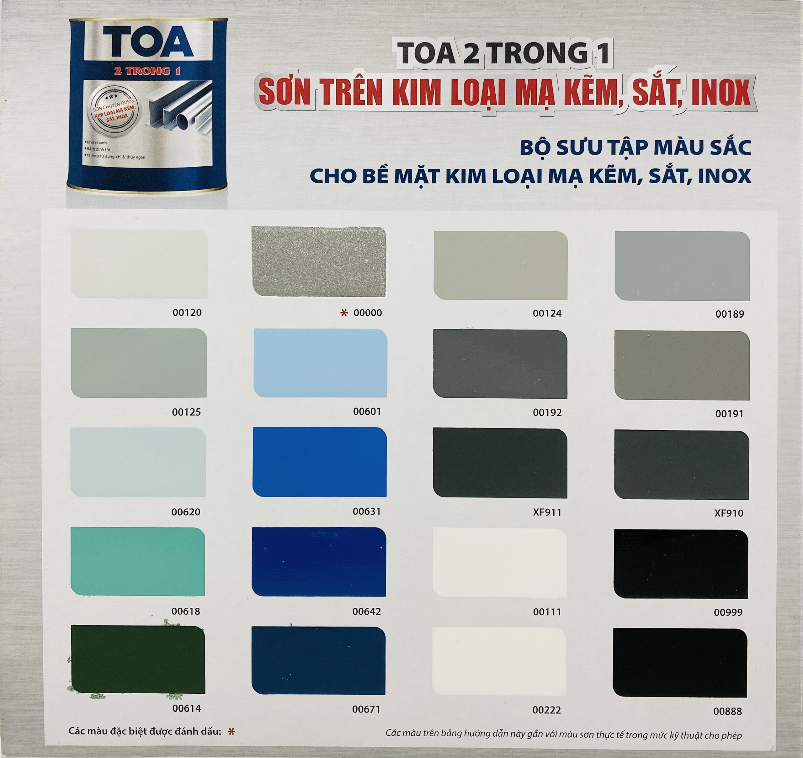 Không sử dụng crom, chì . MỤC ĐÍCH SỬ DỤNG: Sơn TOA 2 trong 1 thích hợp dùng để trang trí và bảo vệ cho các vật liệu thép mạ kẽm, nhôm, inox, sắt, gỗ… Sử dụng được cho cả trong nhà và ngoài trời. THÔNG SỐ KỸ THUẬT Màu sắc: trắng 111, xanh 620, xanh 601, xanh 631, xanh 618, xanh lá 614, xám 125, 120, xanh 642, xanh 671, bạc 000, xám 192, trắng mờ 222, xám xingfa XF911, XF910, XF350, xám 189, xám 191, đen 999, đen mờ 888, đỏ 335, đỏ 336, đỏ nâu 720, cánh dán 721, kem 112, kem 115, vàng 445, 273 cam 232. PHƯƠNG PHÁP THI CÔNG Dụng cụ:cọ, ru lô, máy phun sơn HƯỚNG DẪN THI CÔNG Bước 1 - Chuẩn bị bề mặt: Bề mặt phải khô, sạch, không bị rỉ sét, không dính các tạp chất làm giảm độ bám dính như: bụi bẩn. dầu mỡ, sáp hay tạp chất khác Đối với các bề mặt cũ cần loại bỏ lớp sơn cũ và làm sạch bề mặt bằng giấy nhám thích hợp. Bước 2 - Sơn phủ: Phủ hoàn thiện bằng 2 – 3 lớp sơn TOA2 trong 1 *Lưu ý: Khuấy sơn thật kỹ trước khi sử dụng. Sau khi mở nắp nên sử dụng hết. Nhận giao hàng: Vũng Tàu, Bình Dương, Bình Phước, Long An, Đồng Nai, TP.HCM gửi hàng đi Toàn Quốc giá rẻ.