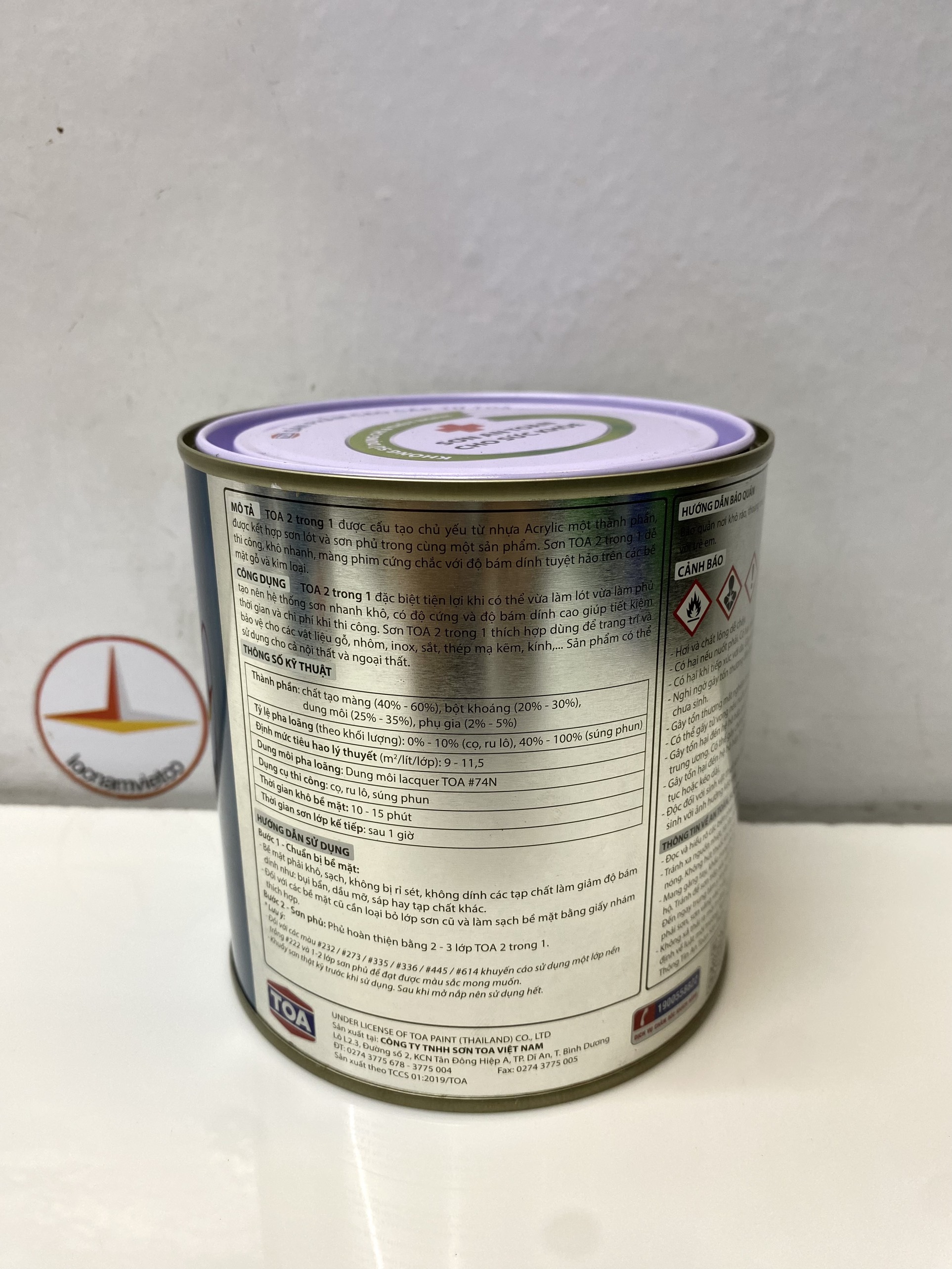 Không sử dụng crom, chì. MỤC ĐÍCH SỬ DỤNG: Sơn TOA 2 trong 1 thích hợp dùng để trang trí và bảo vệ cho các vật liệu thép mạ kẽm, nhôm, inox, sắt, gỗ… Sử dụng được cho cả trong nhà và ngoài trời. THÔNG SỐ KỸ THUẬT Màu sắc: trắng 111, xanh 620, xanh 601, xanh 631, xanh 618, xanh lá 614, xám 125, 120, xanh 642, xanh 671, bạc 000, xám 192, trắng mờ 222, xám xingfa XF911, XF910, XF350, xám 189, xám 191, đen 999, đen mờ 888, đỏ 335, đỏ 336, đỏ nâu 720, cánh dán 721, kem 112, kem 115, vàng 445, 273 cam 232. Thành phần:chất tạo màng (40% - 60%), bột khoáng (20% - 30%), dung môi (25% - 35%), phụ gia (2% - 5%) Thời gian khô: Khô bề mặt:10 – 15 phút Sơn lớp kế tiếp:sau 1 giờ Định mức tiêu hao lý thuyết:8 – 10 (m2/kg/lớp) Đóng gói: 0.8 Kg; 3Kg PHƯƠNG PHÁP THI CÔNG Dụng cụ: cọ, ru lô, máy phun sơn Pha loãng: Dung môi TOA Thinner #74N hoặc xăng nhật Tỷ lệ pha loãng:tùy thuộc vào điều kiện thi công Quét cọ: 0% - 10% theo khối lượng HƯỚNG DẪN THI CÔNG Bước 1 - Chuẩn bị bề mặt: Bề mặt phải khô, sạch, không bị rỉ sét, không dính các tạp chất làm giảm độ bám dính như: bụi bẩn. dầu mỡ, sáp hay tạp chất khác Đối với các bề mặt cũ cần loại bỏ lớp sơn cũ và làm sạch bề mặt bằng giấy nhám thích hợp. Bước 2 - Sơn phủ: Phủ hoàn thiện bằng 2 – 3 lớp sơn TOA 2 trong 1 *Lưu ý: Khuấy sơn thật kỹ trước khi sử dụng. Sau khi mở nắp nên sử dụng hết. Nhận giao hàng: Vũng Tàu, Bình Dương, Bình Phước, Long An, Đồng Nai, TP.HCM gửi hàng đi Toàn Quốc giá rẻ.