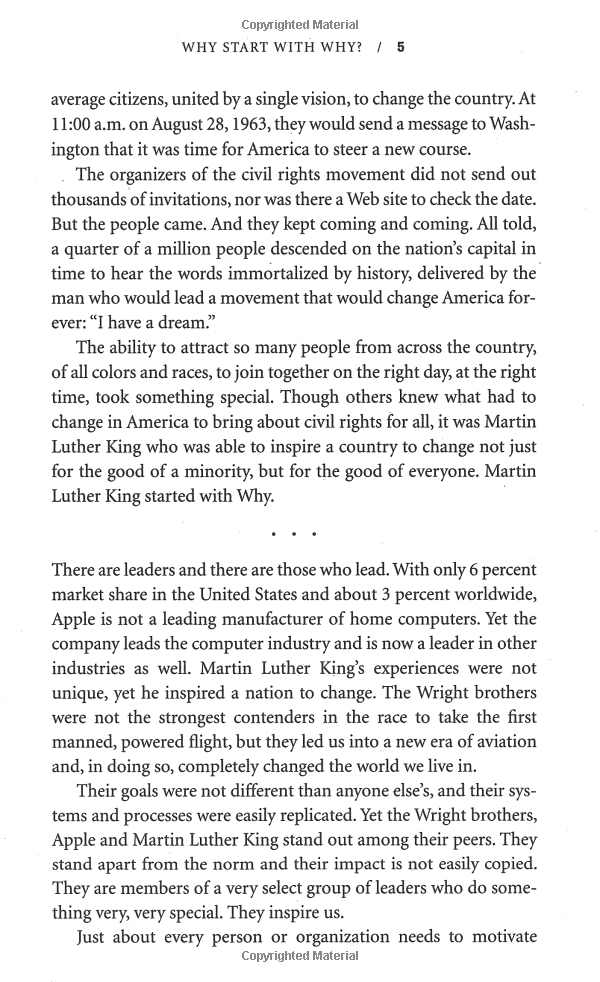 People like Martin Luther King Jr., Steve Jobs, and the Wright Brothers had little in common, but they all started with Why. They realized that people won't truly buy into a product, service, movement, or idea until they understand the Why behind it.
