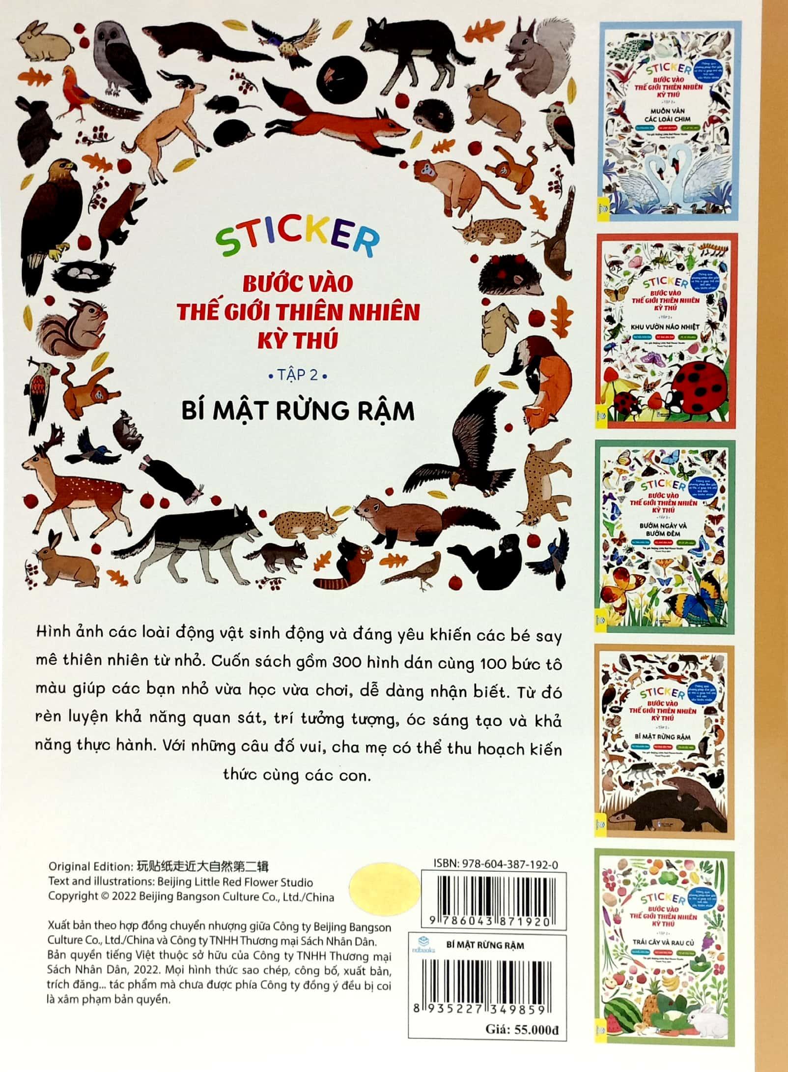Hình ảnh các loài động vật sinh động và đáng yêu khiến các bé say mê thiên nhiên từ nhỏ. Cuốn sách gồm 300 hình dán cùng 100 bức tô màu giúp các bạn nhỏ vừa học vừa chơi, dễ dàng nhận biết. Từ đó rèn luyện khả năng quan sát, trí tưởng tượng, óc sáng tạo và khả năng thực hành. Với những câu đố vui, cha mẹ có thể thu hoạch kiến thức cùng các con.