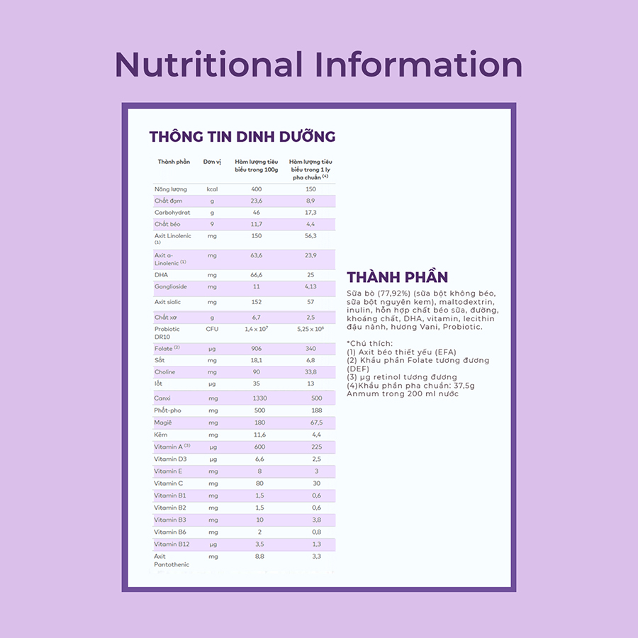 Mua tại TiktokGiới thiệu Anmum Materna hương vani là sữa bột dinh dưỡng tốt nhất dành cho phụ nữ mang thai và cho con bú. Với các dưỡng chất Mind-Q Nutrient Bundle, Anmum Materna là một trong những sản phẩm sữa tốt nhất hiện nay trên thị trường. Chỉ với 2 ly sữa bột Anmum Materna hương vani, nhu cầu Folate, Kẽm và Canxi mỗi ngày của bà bầu đã được đáp ứng đầy đủ. Trong khi Kẽm hỗ trợ trong việc duy trì sự trao đổi chất và chức năng thần kinh khỏe mạnh, thì Canxi củng cố răng và xương. Folate đóng một vai trò quan trọng trong việc phân chia tế bào lành mạnh ở cả mẹ và con, ngăn ngừa dị tật ống thần kinh ở trẻ sơ sinh. Sữa Anmum cho bà bầu là nguồn dinh dưỡng dồi dào cho cả mẹ và con. Chứa đầy DHA và GA, Anmum có hiệu quả cao trong việc phát triển trí não cũng như cơ thể của em bé. Nó cũng chứa sắt đóng vai trò trung tâm trong việc hình thành các tế bào hồng cầu, hỗ trợ cần thiết cho việc tăng 50% lượng máu trong thai kỳ. Ít chất béo, Anmum Materna hương vani là một trong những thức uống lành mạnh nhất cho phụ nữ mang thai và cho con bú. Sữa bột Anmum là loại sữa bột duy nhất dành cho bà bầu có chứa DR10. DR10 kết hợp với Inulin probiotic, cung cấp khả năng miễn dịch mạnh hơn và tiêu hóa khỏe mạnh. Ngoài ra sữa bột Anmun còn có dòng sữa bột Anmum Materna vị sô-cô-la thơm ngon. Thành phần Sữa bò (77,92%) (sữa bột không béo, sữa bột nguyên kem), maltodextrin, inulin, hỗn hợp chất béo sữa, đường, khoáng chất, DHA, vitamin, lecithin đậu nành, hương Vani, Probiotic. Hướng dẫn sử dụng