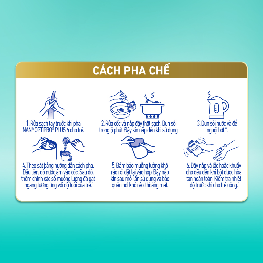 - Đậy nắp và lắc hoặc khuấy đều cho đến khi bột được hòa tan hoàn toàn. Kiểm tra nhiệt độ trước khi cho trẻ uống. Hướng dẫn bảo quản: Bảo quản nơi khô ráo, thoáng mát. Tránh ánh nắng trực tiếp. Nên sử dụng trong vòng 3 tuần sau khi mở hộp. Thông tin thương hiệu Nestlé tin rằng nuôi con bằng sữa mẹ là khởi đầu dinh dưỡng lý tưởng cho trẻ sơ sinh và chúng tôi hoàn toàn ủng hộ khuyến nghị của Tổ chức Y tế Thế giới về việc cho trẻ bú mẹ hoàn toàn trong sáu tháng đầu đời, sau đó là cho trẻ ăn thức ăn bổ sung dinh dưỡng đầy đủ cùng với việc tiếp tục cho trẻ bú mẹ đến hai tuổi hoặc lâu hơn. Chúng tôi cũng nhận thấy rằng việc nuôi con bằng sữa mẹ không phải lúc nào cũng là một lựa chọn khả thi cho các bậc cha mẹ, chúng tôi khuyên bạn nên được tư vấn bởi nhân viên y tế về cách nuôi dưỡng trẻ và thời điểm nên cho ăn thức ăn bổ sung. Nếu bạn quyết định không cho con bú sữa mẹ, hãy nhớ rằng quyết định như vậy có thể khó đảo ngược và sẽ có những ảnh hưởng về mặt xã hội và tài chính. Việc cho trẻ bú bình một phần sẽ làm giảm nguồn cung cấp sữa mẹ. Sữa công thức dành cho trẻ sơ sinh phải luôn được pha chế, sử dụng và bảo quản theo hướng dẫn trên nhãn để tránh rủi ro cho sức khỏe của trẻ. Không bảo quản sản phẩm quá lâu với môi trường nhiệt độ cao. Phải sử dụng trong vòng 3 tuần sau khi mở hộp.