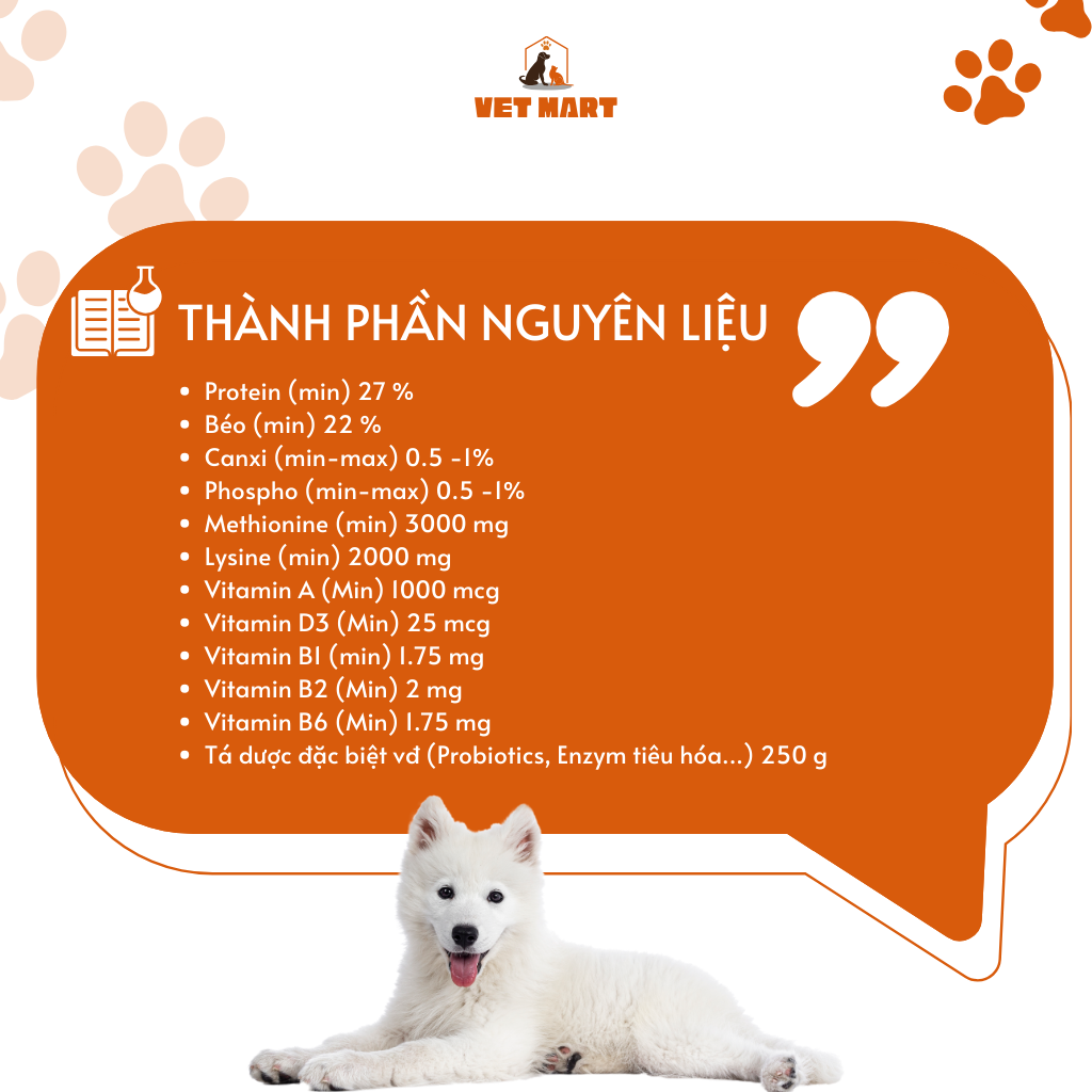 * Calci: cung cấp Canxi, Phospho, vitamin D3. Đáp ứng đầy đủ các nhu cầu về Canxi và khoáng chất cho chó mèo ở tất cả các giai đoạn. * Omega: cung cấp các axit