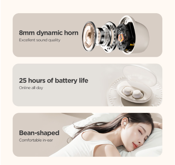 Trình điều khiển 6mm với cấu trúc 3 lớp giúp tăng cường đầu ra của âm bổng và âm trầm. Nhận ra âm thanh mạnh mẽ. Lên đến 5 giờ khi tai nghe được sạc