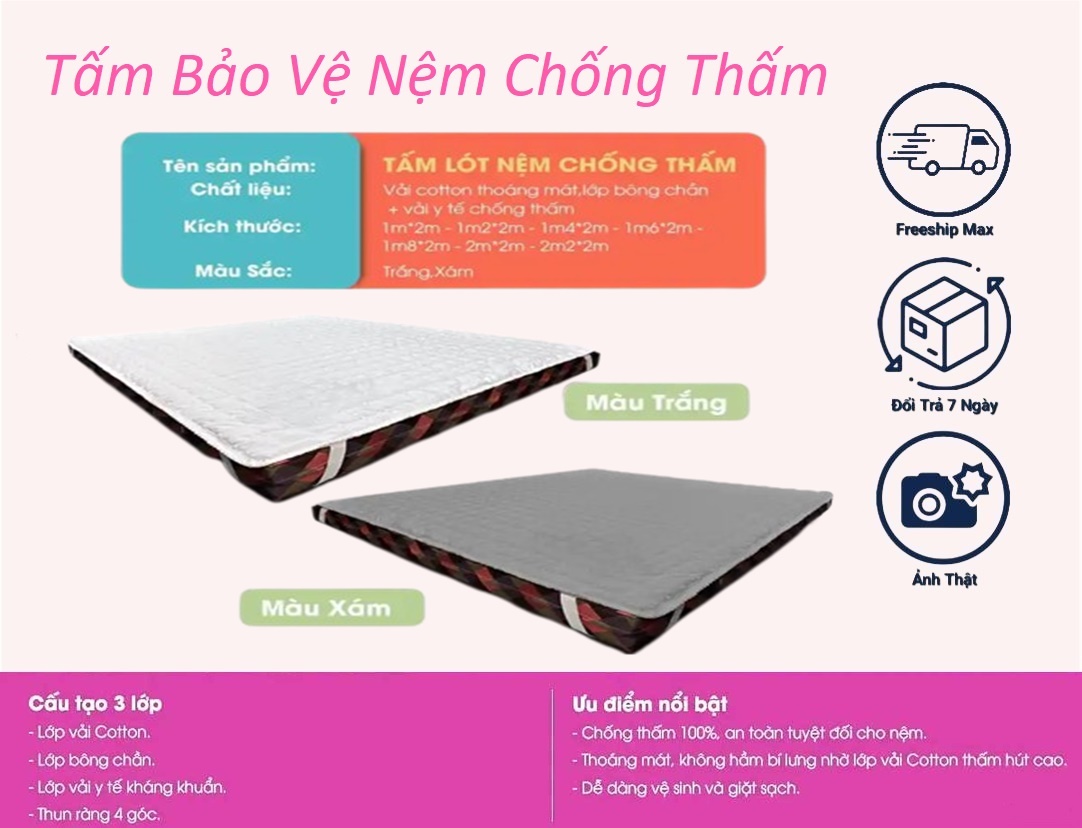 Mua tại TiktokTấm lót bảo vệ nệm chống thấm 100% giúp bạn giải quyết triệt để vấn đề nước đổ lên nệm, hay bé tè dầm, nôn ói làm nệm bị dơ và có mùi khó chịu. Rất thích hợp khi bạn vừa mua một tấm nệm mới, hoặc muốn bảo quản để nệm sử dụng được lâu dài. Cấu tạo sản phẩm