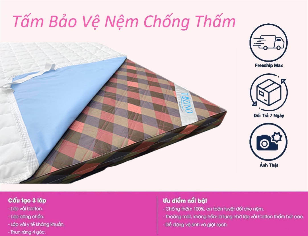 Mô tả chi tiết Lựa chọn tấm bảo vệ nệm có kích thước tương ứng với nệm. Kích thước tiêu chuẩn:1m2x2m; 1m4x2m; 1m6x2m; 1m8x2m; 2mx2m Cấu trúc 3 lớp: 2 lớp ngoài là vải Poly