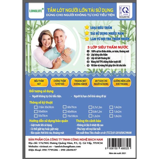 - Lớp thứ 5: lớp vải giúp tấm lót hạn chế bị xê dịch. Trong trường hợp cần, vẫn có thể dùng nằm trực tiếp. Đặc biệt lớp này bảo vệ lớp chống thấm nên tấm lót giặt máy vẫn bền lâu, an toàn. III. Kích thước: Tấm lót chống thấm cho người già/miếng lót chống thấm cho người lớn LONGLIFE có nhiều kích thước phù hợp với nhiều mục đích sử dụng khác nhau: Lót mông, từ lưng trở xuống: size 40x60cm, 50x70cm, 60x70cm, 60x90cm, 62x114cm, 70x100cm, 70x130cm, 80x120cm. Lót cả giường: size 90x190cm, 120x200cm, 140x200cm, 160x200cm, 180x200cm, 200x220cm. IV. Điểm đặc biệt của tấm lót chống thấm cho người lớn LONGLIFE ✓ Mặt hàng tấm lót chống thấm cho người già duy nhất trên thị trường có cấu tạo 5 lớp được sản xuất tại Việt Nam và có thể tái sử dụng nhiều năm. ✓ Thấm hút nước cực tốt: nhờ cấu tạo đến 5 lớp, có thể thay thế cho tã giấy. ✓ Siêu mềm, êm: do tấm lót dày, có lớp bông hút nước. ✓ Kháng khuẩn cao: nhờ làm từ vải 100% sợi tre, không phải từ nilong hay cao su. ✓ Chống thấm 100%: tuyệt đối không thấm xuống giường, nệm dù có bao nhiêu nước. ✓ Thoáng khí và dễ chịu, không gây dị ứng và hăm da nhờ chất liệu 100% sợi tre. ✓ Sử dụng tiện lợi bất cứ nơi đâu: giường, nệm, sàn nhà, ngoài trời,…. ✓ Giặt tay hay giặt máy đều tốt, và sử dụng nhiều lần (Độ bền tới 5 năm). ✓ Đường may chắc chắn (bước 1 vắt sổ, bước 2 may viền 1 kim). V. Nơi sản xuất: – Sản xuất tại Việt Nam bởi Công ty TNHH Công nghệ Bách Nam. Công ty Bách Nam cũng là đơn vị sản xuất các loại tấm lót chống thấm chất lượng nổi tiếng như VIETMAT, TILO, SUPERMAT. VI. Kiểm định chất lượng – Sản phẩm được kiểm định khả năng chống thấm, an toàn đối với người sử dụng tại Viện nghiên cứu dệt may tại (VTRSI)