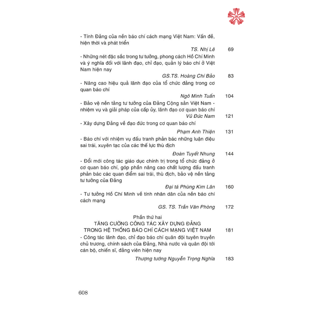Cuốn sách tập hợp các bài tham luận trong Hội thảo khoa học “Tăng cường công tác xây dựng Đảng trong các cơ quan báo chí”, do Ban Tuyên giáo Trung ương Đảng chủ trì,