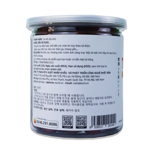 Khối lượng tịnh: 250g. THÀNH PHẦN: - Táo đỏ sấy khô. HƯỚNG DẪN SỬ DỤNG: - Dùng ăn trực tiếp hoặc chế biến các món ăn tùy theo sở thích. - Ngâm rượu, hãm trà,