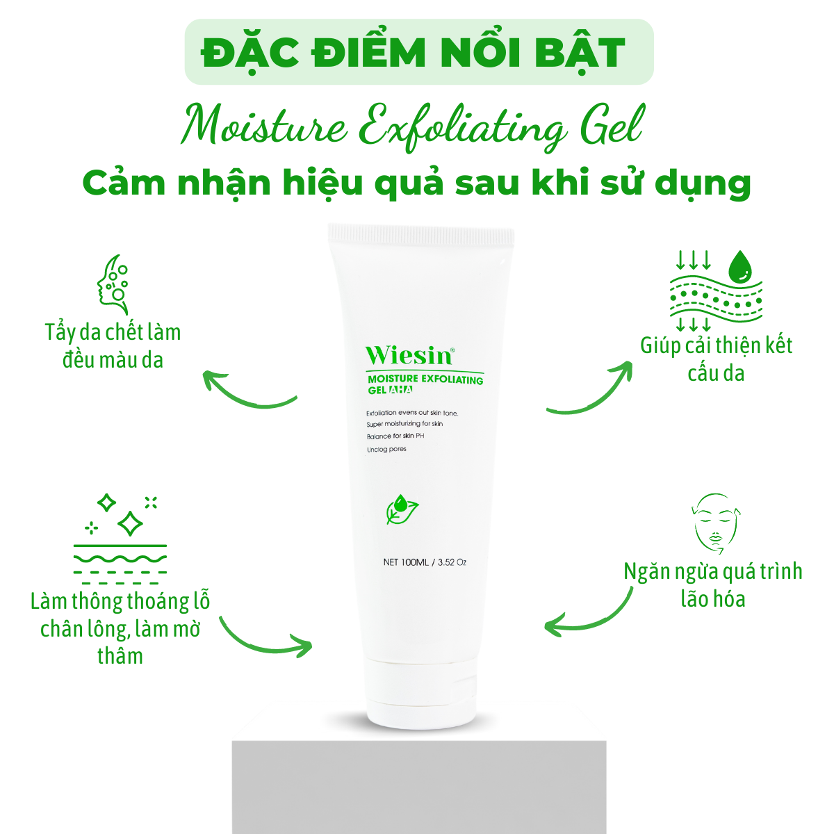Tẩy tế bào chết cho da mặt Wiesin Moisture Exfoliating Gel 100ml - WS02 1. CÔNG DỤNG GEL TẨY TẾ BÀO CHẾT WIESIN: - Tẩy da chết làm đều màu da. - Giúp cải thiện