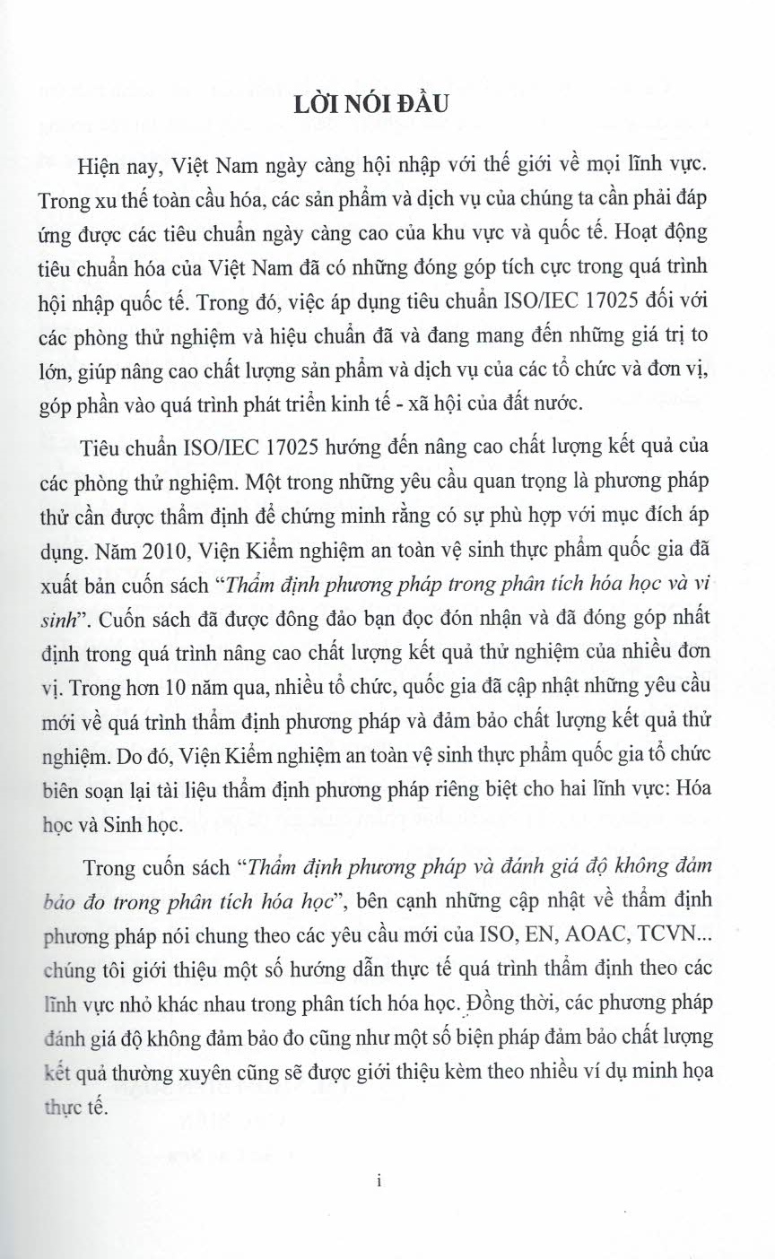 Mua tại TiktokCuốn sách hướng tới các độc giả là nghiên cứu viên, kiểm nghiệm viên đang thực hiện công tác thử nghiệm, đảm bảo chất lượng tại các phòng thử nghiệm liên quan đến các phép thử hóa học trong nhiều lĩnh vực như an toàn thực phẩm, dược phẩm, dược liệu, mỹ phẩm, thức ăn chăn nuôi, thú y… Sách cập nhật những phương pháp thẩm định mới theo yêu cầu của ISO, EN, AOAC, TCVN… kèm một số biện pháp đảm bảo chất lượng kết quả thường xuyên và ví dụ minh họa thực tế.