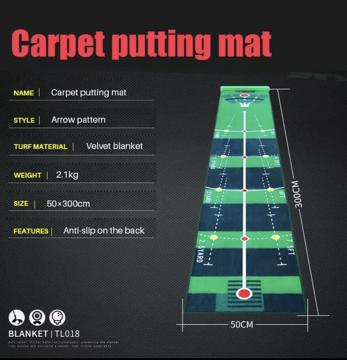 Tấm thảm có thể xử lý từ cách tiếp cận đến toàn bộ cú đánh Miếng bọt biển cao su gắn dưới đáy làm mềm tác động tại thời điểm đánh. Thống số kỹ thuật: