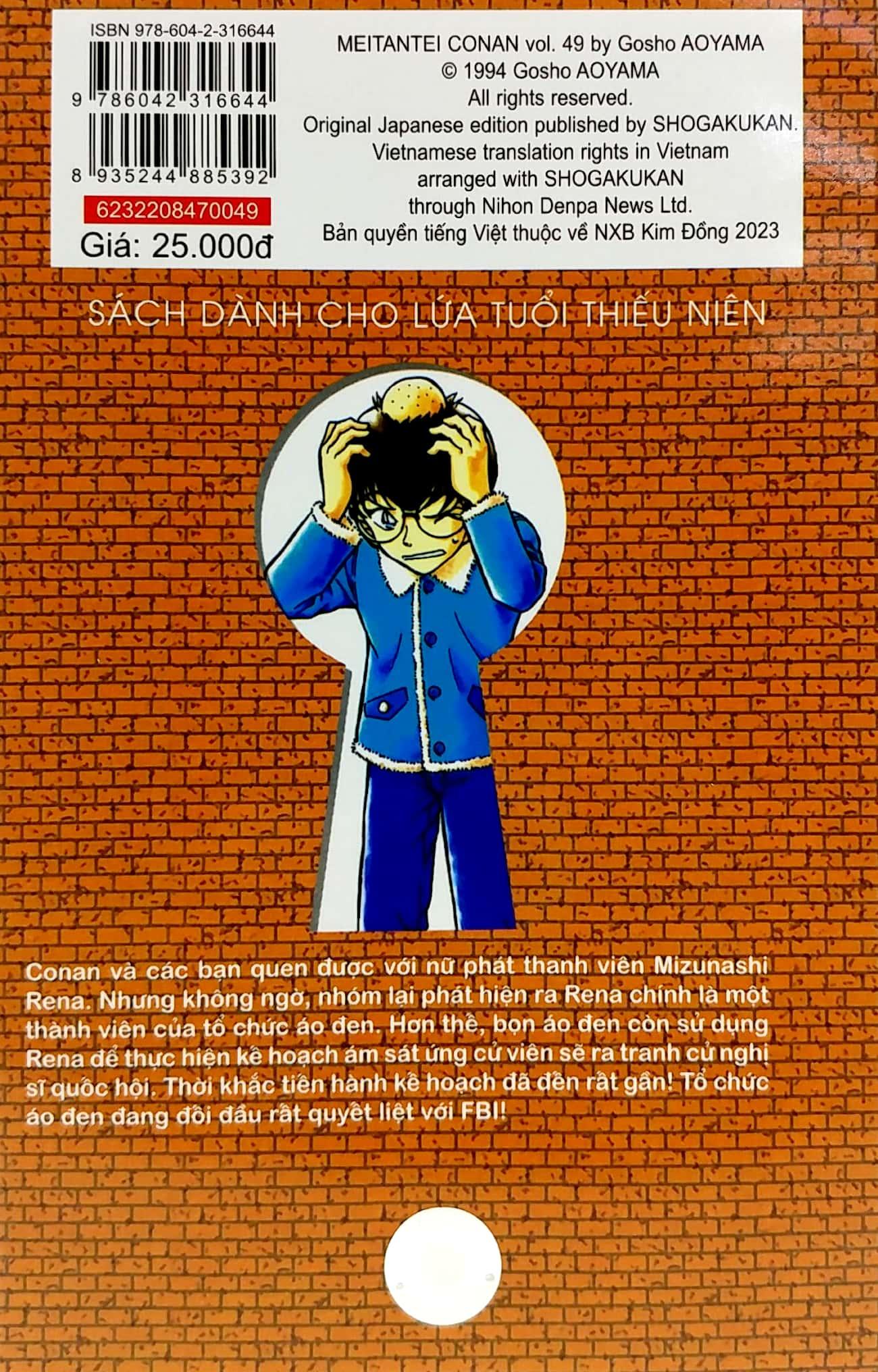 Mua tại TiktokThám Tử Lừng Danh Conan - Tập 49 Conan và các bạn quen được với nữ phát thanh viên Mizunashi Rena. Nhưng không ngờ, nhóm lại phát hiện ra Rena chính là một thành viên của tổ chức áo đen. Hơn thế, bọn áo đen còn sử dụng Rena để thực hiện kế hoạch ám sát ứng cử viên sẽ ra tranh cử nghị sĩ quốc hội. Thời khắc tiến hành kế hoạch đã đến rất gần! Tổ chức áo đen đang đối đầu rất quyết liệt với FBI! Gosho Aoyama Xin chào, tôi là Aoyama đây!! Chắc tại tôi già rồi (cười) nên dạo này rất khổ sở vì bệnh đau lưng, đến mức đành phải mua cái ghế massage. Xử lí nốt công việc, đi tắm, thay đồ ngủ, chuẩn bị xong tất cả mọi việc rồi… bật công tắc! Ngay lập tức tôi sẽ nghe thấy câu “xin mời đến với không gian thư giãn”…