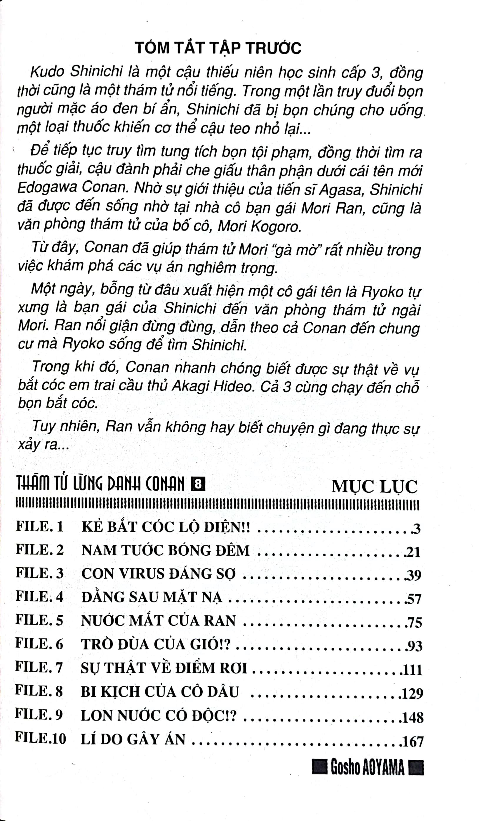 Thám Tử Lừng Danh Conan - Tập 8 Xem chút nữa là Ran đã phát hiện ra thân phận của tớ rồi! Cũng may ứng biến kịp nên nguy hiểm tạm qua đi, nhưng giá mà tớ có thể làm cho cô ấy yên tâm hơn thì tốt biết mấ Tớ đâu phải không muốn trở lại là Kudo Shinichi, nhưng cứ hết vụ án này đến vụ khác xảy ra khiến tớ chẳng còn tâm trí nghĩ đến chuyện đó nữa!! Rồi bỗng nhiên "Nam tước bóng đêm", kẻ chỉ có trong trí tưởng tượng lại từ đâu bay tới!