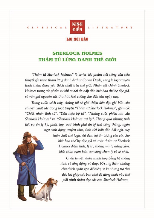 Sherlock Holmes – thám tử tư vĩ đại nhất trong văn học thế giới. Lạnh lùng, quyết đoán, dũng cảm, giàu lòng chính nghĩa, tài quan sát đáng kinh ngạc, khả năng suy luận tuyệt vời nhờ vào những chứng cứ khó ngờ nhất khám phá ra chân tướng ẩn giấu sau những sự thực bị bẻ cong hình thành một kinh điển bất hủ trong lĩnh vực văn học trinh thám.