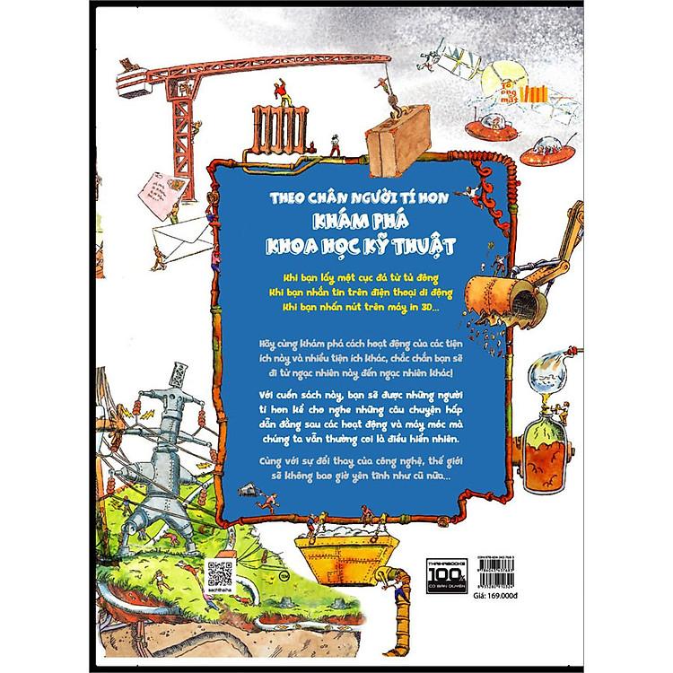 Khám phá khoa học kỹ thuật là một trong bộ ba sách khoa học Theo chân người tí hon, cuốn sách có minh họa tuyệt vời, đưa chúng ta tìm hiểu cụ thể về cấu tạo và cách hoạt động của những máy móc xung quanh chúng ta, các sơ đồ lớn, đầy màu sắc được làm sống động bởi những người tí hon chạy xung quanh vận hành.