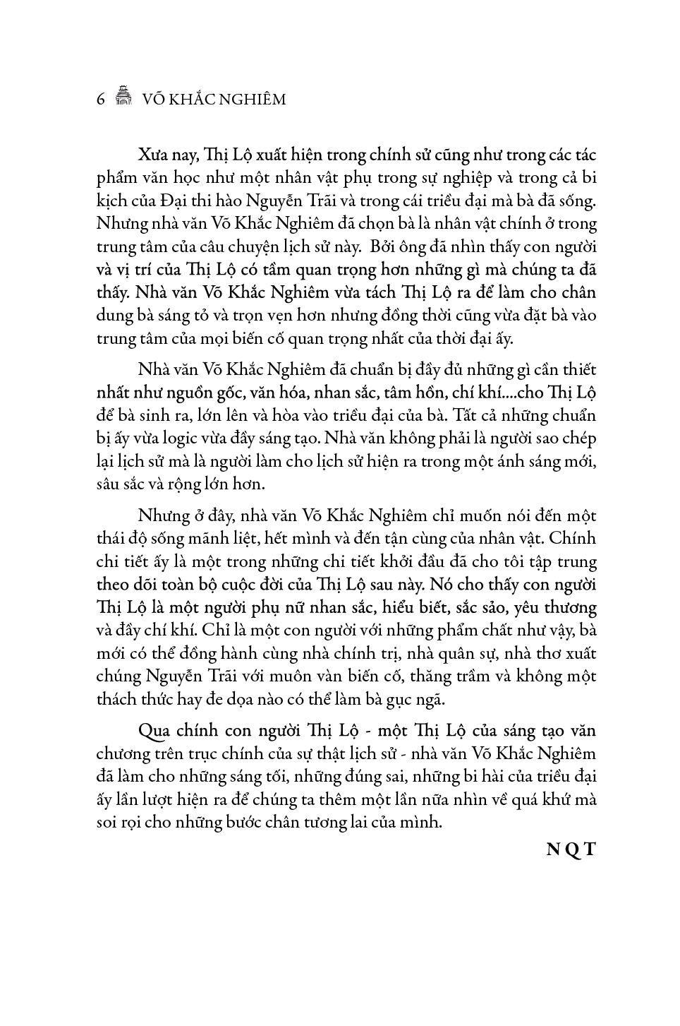 Việc chọn Thị Lộ làm nhân vật chính cho cuốn tiểu thuyết dày gần hàng trăm trang là một thách thức không nhỏ đối với nhà văn Võ Khắc Nghiêm. Bởi tư liệu về Thị Lộ được sử sách ghi lại không nhiều và có không ít những điểm về cuộc đời bà chưa thống nhất và có những tình tiết mơ hồ ,thậm chí hoang đường, ác độc… Bởi quan niệm và cách đọc các tác phẩm văn học về đề tài lịch cử còn rất nhiều giới hạn và không ít bảo thủ. Chính vậy mà lâu nay, các tác phẩm về đề tài lịch sử và đặc biệt về các nhân vật lịch sử có thể tạo ra được phần nào không khí của một giai đoạn lịch sử hoặc một sự kiện lịch sử mà nhân vật ấy tham dự, chứ ít tạo ra được nhân vật một cách sống động mà người đọc có thể cảm nhận được từng hơi thở của nhân vật đó mà từ đấy cảm nhận được hơi thở của thời đại nhân vật đã sống.