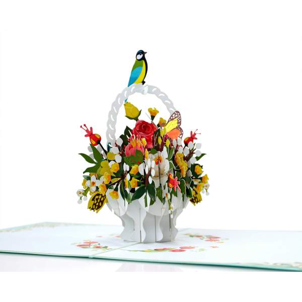 Gửi gắm yêu thương và sự trân trọng với thiệp 3D Pop Up giỏ hoa & chim. Khi mở ra, hình ảnh giỏ hoa rực rỡ đầy màu sắc bật nổi, kèm chú chim nhỏ