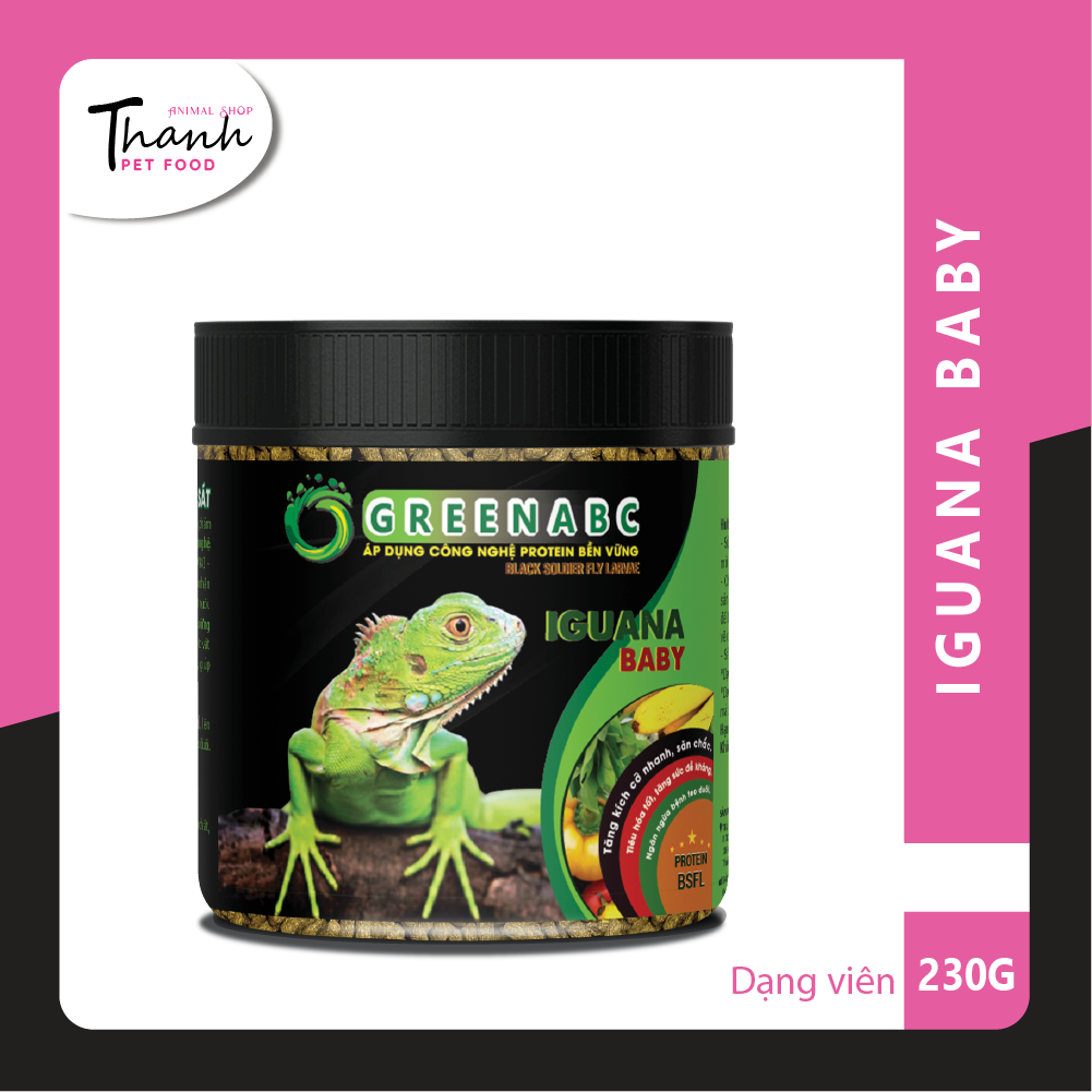 GREENABC là thức ăn cao cấp dành cho Iguana Baby - Rồng Nam Mỹ Baby Đặc biệt sản phẩm GREENABC được sản xuất theo phương pháp Áp dụng công nghệ PROTEIN bền vững từ bột đạm G.Meal rất giàu PROTEIN – CANXI – LIPID có trong BSFL, đã được Mỹ (AAFCO) và EU chấp nhận đưa vào công thức cho ngành sản xuất thức ăn dành cho vật nuôi.