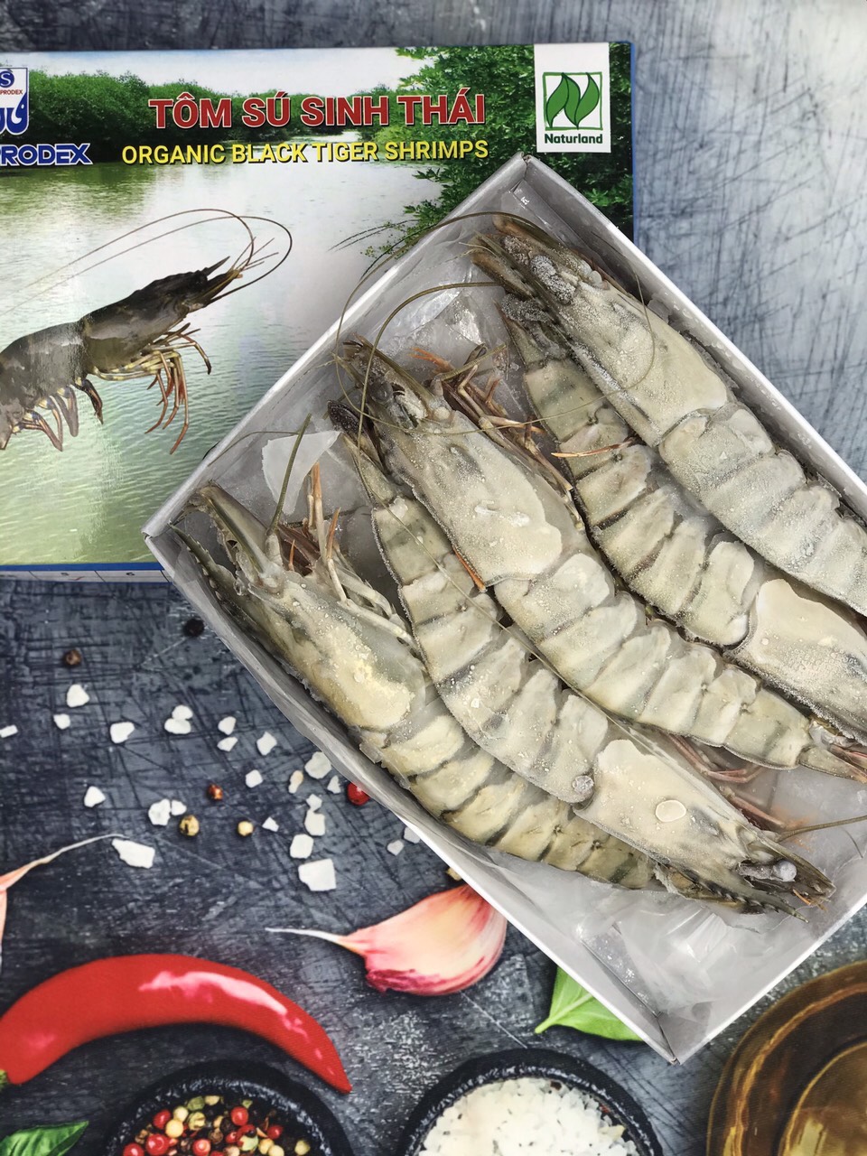 **Tôm sú nguyên con Organic đông lạnh được đóng túi, cấp đông lúc tươi, tôm khi rã đông đảm bảo vẫn giữ được độ ngon và vị ngọt của tôm.
