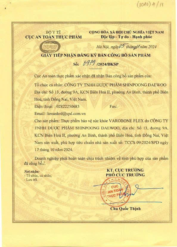 Đặt cam kết: “Vì sức khỏe mọi người” vào từng sản phẩm, Shinpoong Pharma không ngừng nỗ lực tạo nên những giải pháp toàn diện về sức khỏe dựa trên gần 63 năm nghiên cứu khoa học, thành tựu về công nghệ và nguyên liệu chất lượng nhập khẩu, tuyển chọn từ các chuyên gia hàng đầu tại Hàn Quốc và Việt Nam. THỰC PHẨM BẢO VỆ SỨC KHỎE | VAROBONE OSTEO - Viên uống bổ sung CALCI, Vitamin D3 Hỗ trợ cải thiện tình trạng loãng xương ở người lớn; cải thiện xương và răng chắc khỏe THÀNH PHẦN - Calci carbonat (tương đương 400 mg Calci) . 1000 mg - Magnesi oxyd (tương đương 120 mg Magnesi) ... 199 mg - Kẽm gluconat (tương đương 10 mg Kẽm) ... 70 mg - Vitamin B6 (dưới dạng Pyridoxin hydroclorid) .... 2 mg - Vitamin D3 (dưới dạng Cholecalciferol) . 400 IU CÔNG DỤNG: Hỗ trợ cải thiện răng và xương chắc khỏe. Hỗ trợ cải thiện tình trạng loãng xương ở người lớn. Bổ sung Calci, vitamin D3 cho cơ thể. CÁCH DÙNG Người lớn và trẻ em trên 14 tuổi: 1 viên/lần x 1 – 2 lần/ngày, uống sau khi ăn sáng và ăn trưa. ĐỐI TƯỢNG SỬ DỤNG Người lớn và trẻ em trên 14 tuổi, phụ nữ có thai và cho con bú có nhu cầu bổ sung Calci, vitamin D3 cho cơ thể. Người lớn bị loãng xương BẢO QUẢN Trong bao bì kín, ở nơi khô, tránh ánh sáng, nhiệt độ dưới 30ºC. HSD: 36 tháng kể từ ngày sản xuất. QUY CÁCH