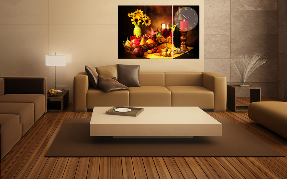 Tranh treo là sự kết hợp tinh tế giữa đồng hồ cùng tranh nghệ thuật đặc sắc. Tranh là sự tái hiện sinh động một bàn ăn kiểu Tây với rượu vang, trái cây cùng ánh nến dịu nhẹ, cùng với cách phối màu mang phong cách cổ điển càng làm tăng thêm sự sang trọng cho bố cục của tranh. Chất liệu PP cao cấp cùng kĩ thuật in tiên tiến cho ảnh chất lượng cao, không bị nhòe ảnh, bể ảnh, màng bảo vệ bóng mờ gia tăng khả năng chịu nước, chống bay màu tốt.=