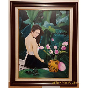 Tranh sơn dầu thiếu nứ & hoa sen Chất liệu tranh sơn dầu vẽ tay trên vải toan ( vải bố ) chuyên dụng Khung tranh màu vân gỗ Composits cao cấp không cong vênh