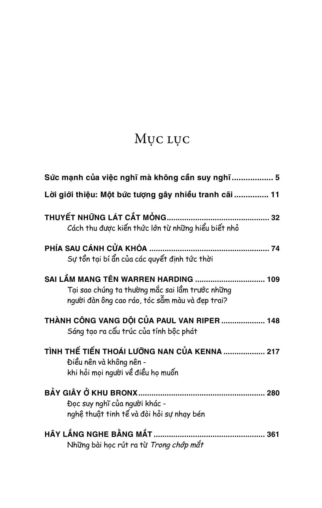 Trong chớp mắt sẽ cho chúng ta gặp một nhà tâm lý học, người có thể tiên đoán cuộc hôn nhân nào sẽ đổ vỡ chỉ dựa vào vài phút quan sát cặp vợ chồng, một huấn luyện viên tennis, người có thể biết khi nào một vận động viên sẽ phạm lỗi kép thậm chí trước khi vợt kịp chạm đến bóng, một chuyên gia thẩm định đồ cổ, người có thể nhận ra sự giả mạo bằng một cái nhìn thoáng qua. Cuốn sách kỹ năng này tiết lộ một bí mật: những người quyết định vĩ đại không phải là những người sử dụng hầu hết thông tin, thời gian để cân nhắc kĩ lưỡng, mà lại là những người thành thạo trong nghệ thuật “lát cắt mỏng”, nắm bắt được mọi khía cạnh vấn đề từ một lát cắt mỏng.