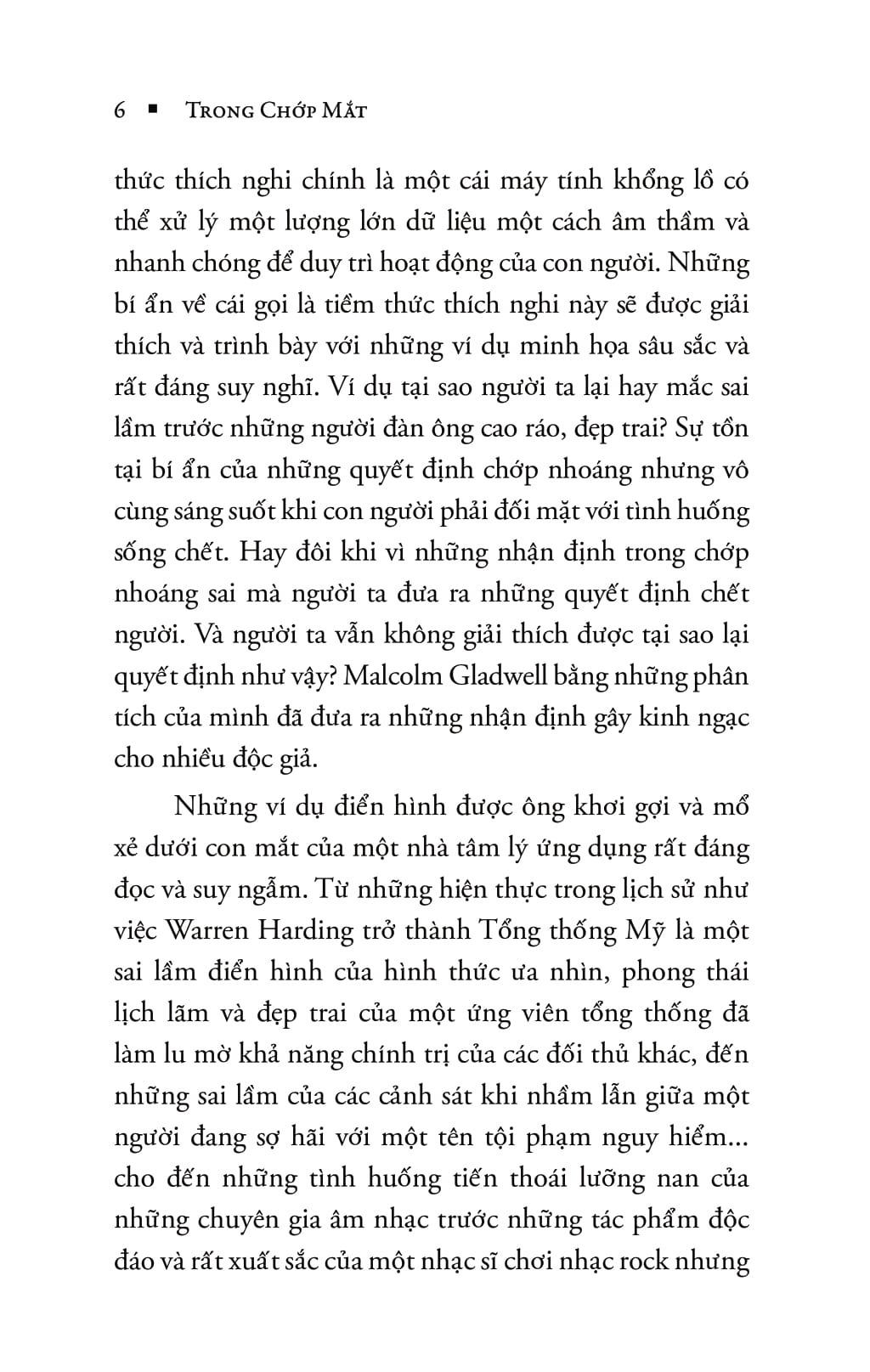 Trong chớp mắt là một cuốn sách chiến lược viết về sức mạnh của việc nghĩ mà không cần suy nghĩ, về những quyết định đưa ra chỉ trong một cái chớp mắt thực sự không hề tầm thường như mọi người vẫn nghĩ. Vì sao một số người luôn là những người quyết định sáng suốt, trong khi số khác lại luôn lầm lẫn, quẩn quanh… Tại sao một số người hành động theo bản năng của họ và chiến thắng, một số người lại luôn kết thúc bằng sai lầm. Não của chúng ta thực sự hoạt động thế nào: trong công sở, trong lớp học, trong bếp và phòng ngủ… Và vì sao những quyết định đúng đắn nhất lại thường là những quyết định không thể lý giải rõ ràng cho người khác.