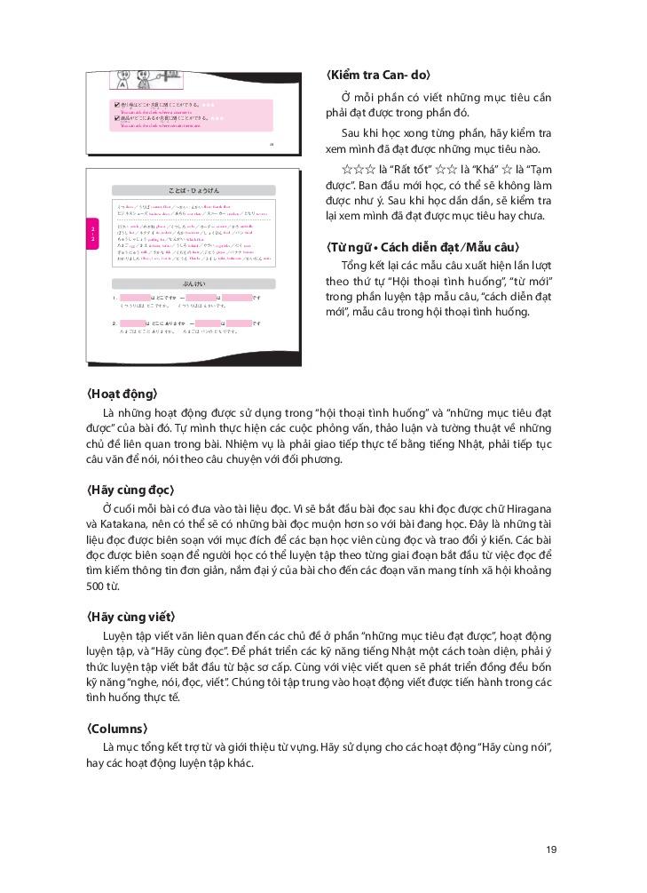 Giáo trình được biên soạn nhằm giúp người học giao tiếp bằng tiếng Nhật tốt hơn trong các hoạt động xã hội. Các tình huống học tập trong giáo trình là những tình huống thường được sử dụng để giao tiếp trên thực tế, được lựa chọn từ các lĩnh vực trong đời sống sinh hoạt, trường học và xã hội.