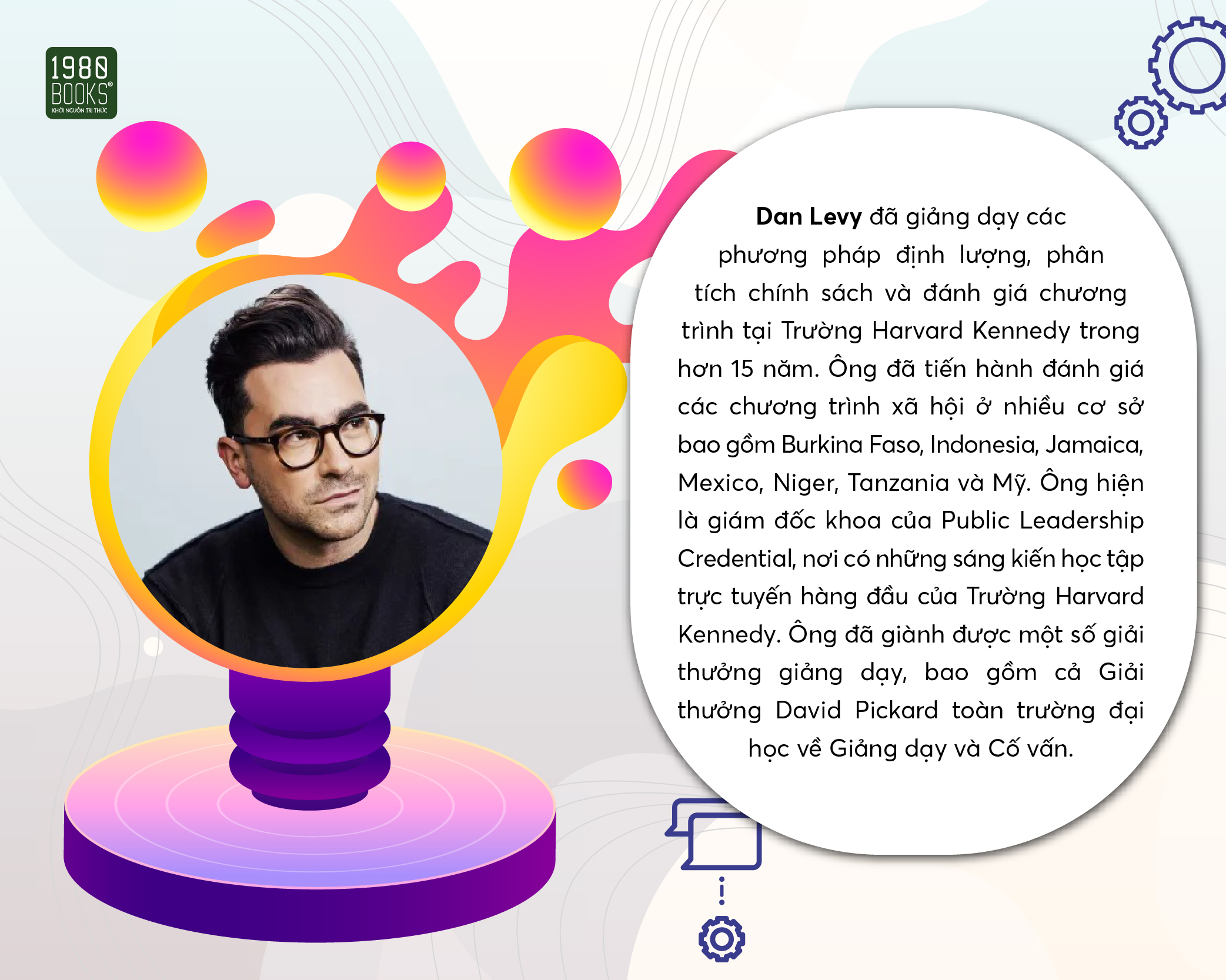 Tác giả: Dan Levy đã giảng dạy các phương pháp định lượng, phân tích chính sách và đánh giá chương trình tại Trường Harvard Kennedy trong hơn 15 năm. Ông đã tiến hành đánh giá các chương trình xã hội ở nhiều cơ sở bao gồm Burkina Faso, Indonesia, Jamaica, Mexico, Niger, Tanzania và Mỹ. Ông hiện là giám đốc khoa của Public Leadership Credential, nơi có những sáng kiến học tập trực tuyến hàng đầu của Trường Harvard Kennedy. Ông đã giành được một số giải thưởng giảng dạy, bao gồm cả Giải thưởng David Pickard toàn trường đại học về Giảng dạy và Cố vấn. Ông đã viết Teaching Effectively with Zoom: A practical guide to engage your students and help them learn (tạm dịch: Giảng dạy hiệu quả với Zoom: Một hướng dẫn thực tế để thu hút sinh viên và giúp họ học tập). Sự giảng dạy của ông đã được giới thiệu trong một cuốn sách có tựa đề Invisible Learning (tạm dịch: Học tập vô hình) của David Franklin. Ông lớn lên ở Venezuela và nhận bằng Tiến sĩ Kinh tế tại Đại học Northwestern.