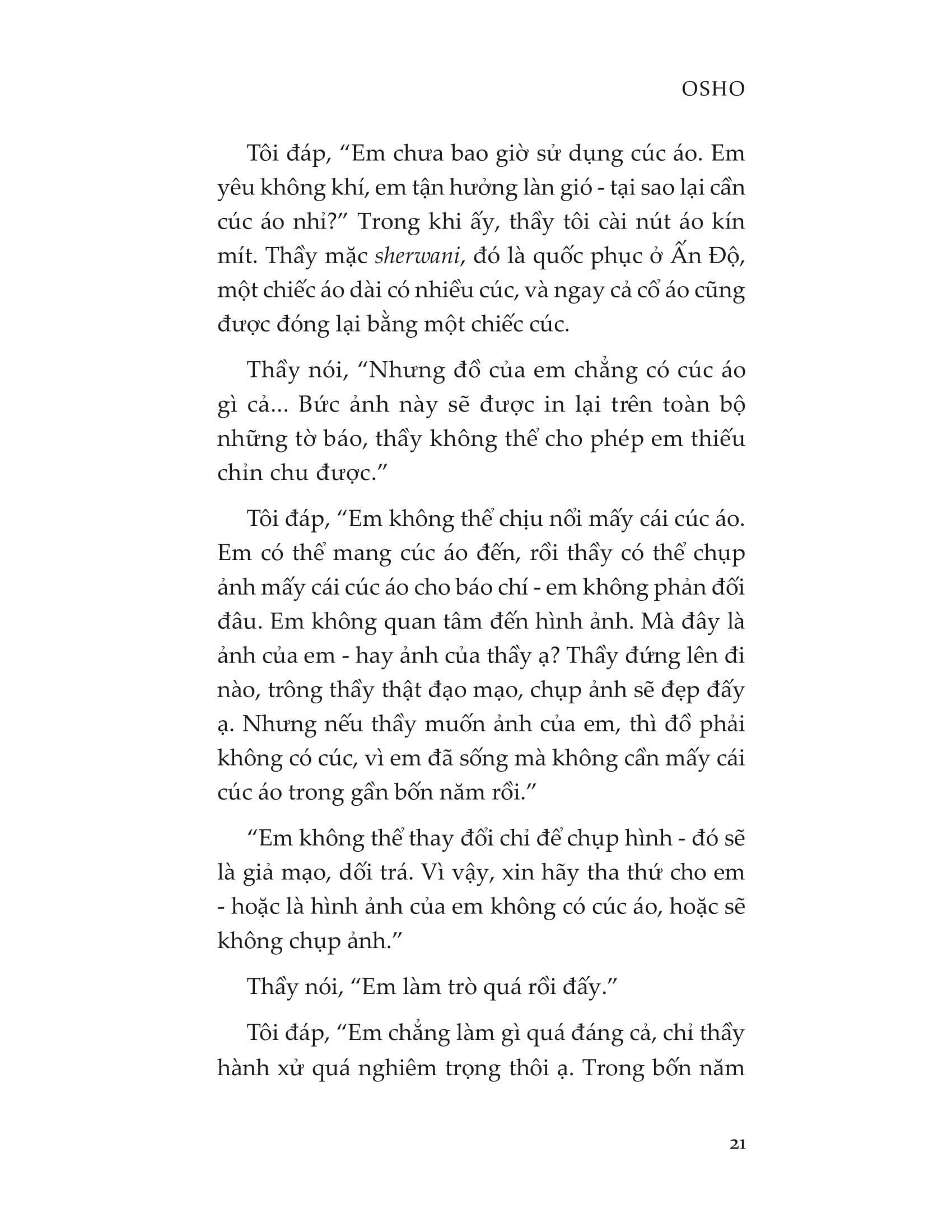 Osho (1931-1990) là một đạo sư người Ấn được hàng triệu người trên thế giới tìm đọc. Hàng trăm cuốn sách cùng vô số bài thuyết giảng của ông về đề tài tâm linh đã để lại những dấu ấn khó phai trong lòng công chúng. Giáo lý của Osho đậm chất phương Đông, nhấn mạnh tới tầm quan trọng của thiền và sự tỉnh thức, từ đó hướng người tu tập buông bỏ cái tôi, nuôi dưỡng tình thương yêu và đánh thức nguồn năng lượng nguyên thủy từ trong căn cốt.