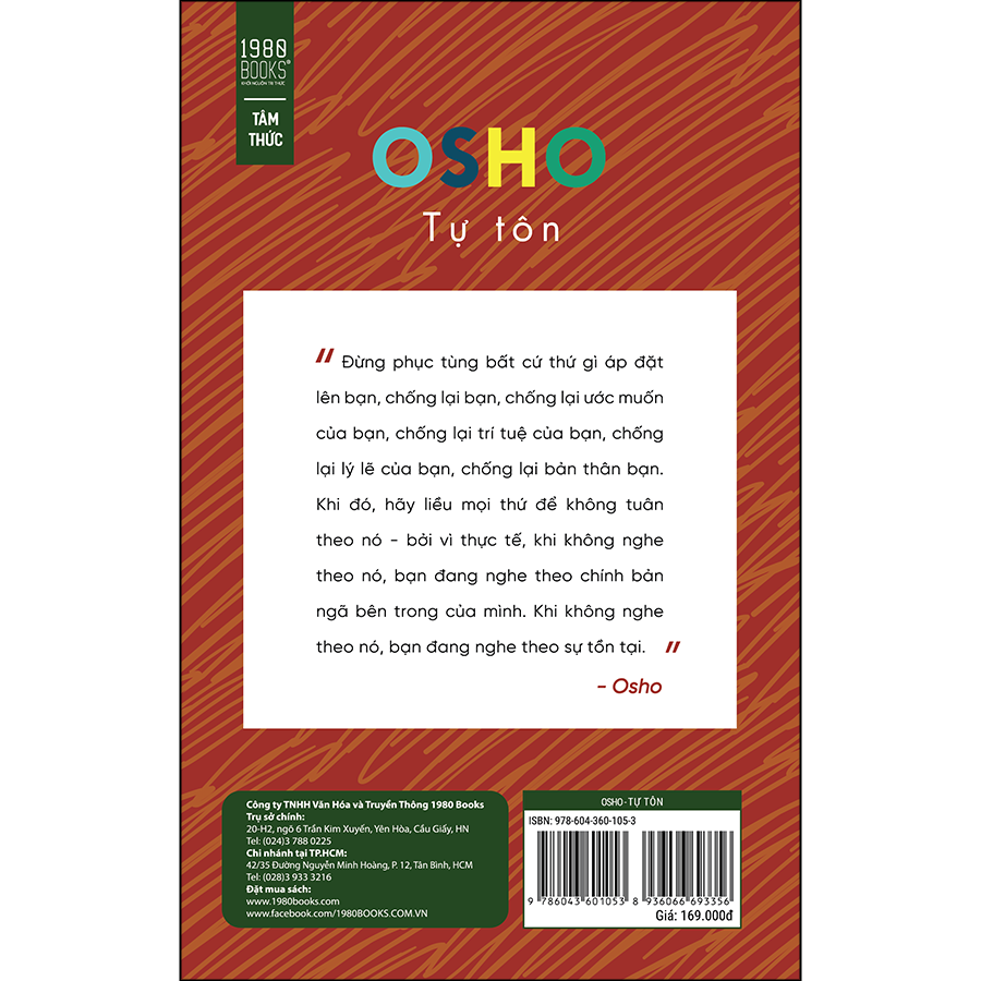 Trong Tự tôn, Osho giới thiệu đến độc giả ba yếu tố trụ cột: sự quan sát, sự nhận thức và sự tỉnh táo. Đây là chìa khóa để khám phá lại bản chất độc nhất của chúng ta, “cái tôi” chân thực nằm trong tất cả chúng ta. Và một khi ta tiến bước trên hành trình khám phá, thì mọi lẽ sai lầm mà chúng ta vẫn luôn mang theo người từ trước đến nay sẽ đơn giản là biến mất.