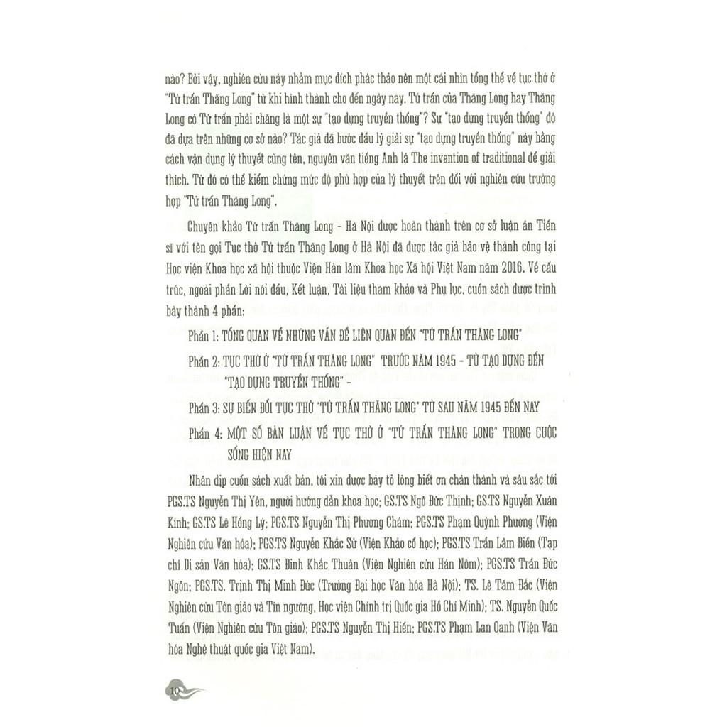 Để lý giải những câu hỏi này, tác giả sẽ mô tả quá trình tạo dựng tục thờ ở “Tứ trấn Thăng Long - Hà Nội” qua các truyền thuyết, hệ thống thần điện, nghi lễ phụng thờ bốn Đức thần ở Tứ trấn và xem xét, đánh giá cơ sở, nền tảng về không gian văn hóa xã hội cho sự hình thành và phát triển nơi thờ bốn vị thần trong bốn ngôi đền (Tứ trấn) ở Hà Nội.