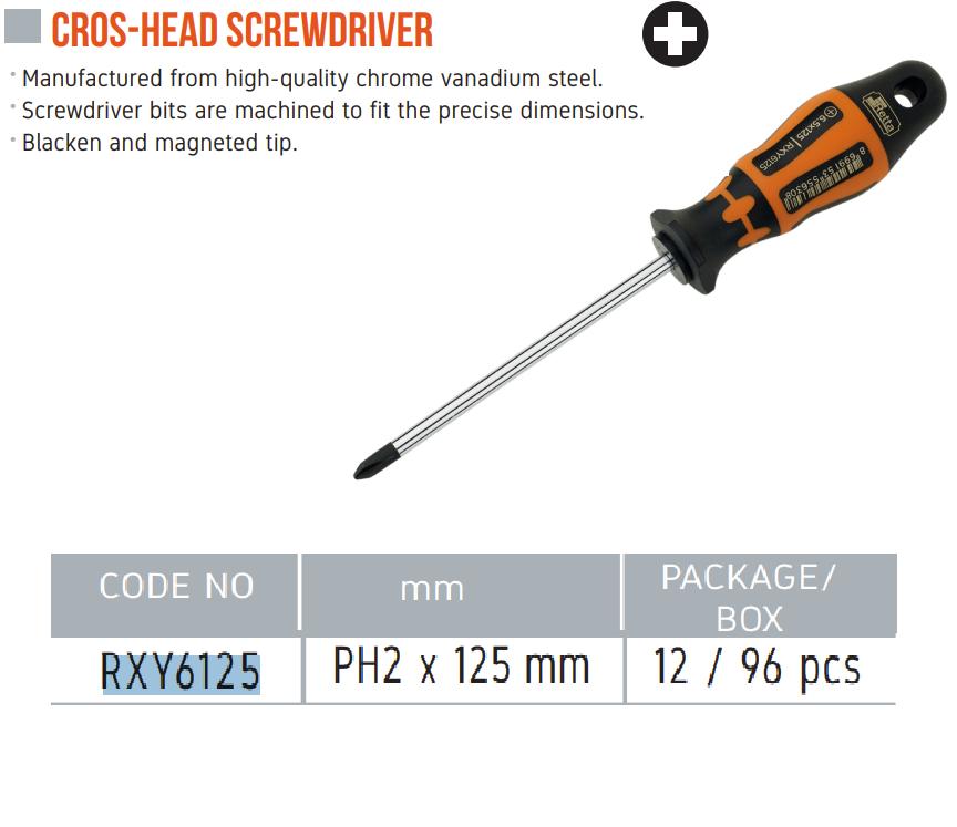 Tua vít 4 cạnh PH2 x 125mm Retta RXY6125 Thổ Nhĩ Kỳ Model:RXY6125 Chiều dài:125mm Là dụng cụ cầm tay, chuyên dùng để vặn, siết đóng ốc vít bằng tay. Sản phẩm được gia công rất