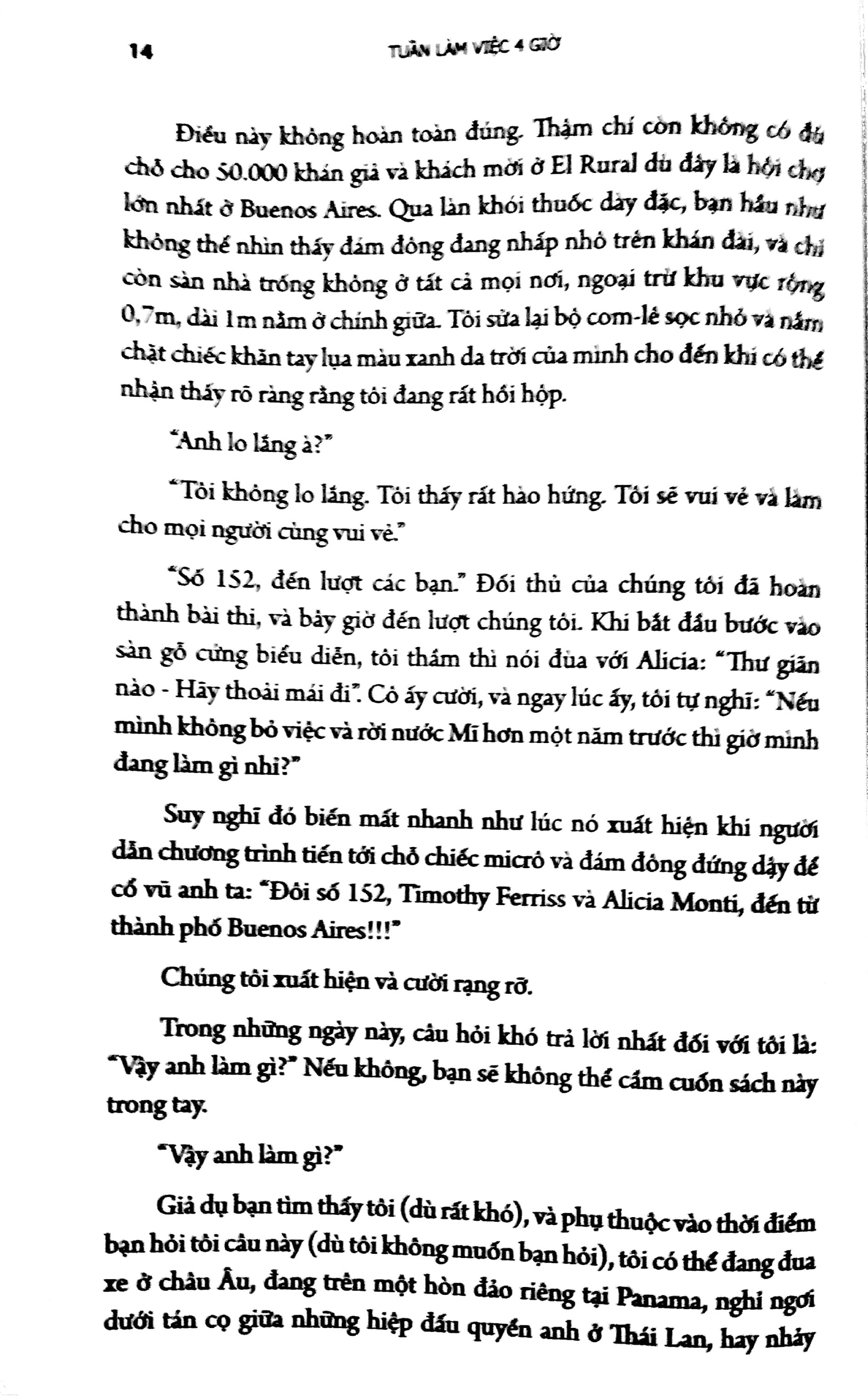 Trong cuốn sách này, Tim sẽ chỉ cho chúng ta thấy Làm thế nào để có được lối sống hoàn toàn tự do của một triệu phú mà không cần phải có 1 triệu đô la? Chỉ có một câu trả lời đơn giản, anh đã biết tách biệt thu nhập với thời gian và tạo ra lối sống lý tưởng cho mình, đi du lịch vòng quanh thế giới và tận hưởng những điều thú vị nhất trên hành tinh này. Và Tim còn chỉ cho bạn anh đã làm như thế nào để từ làm việc 14 giờ/ngày và kiếm 40.000 đô-la/ năm thành làm việc 4 giờ/ tuần và kiếm 40.000 đô la/ tháng?