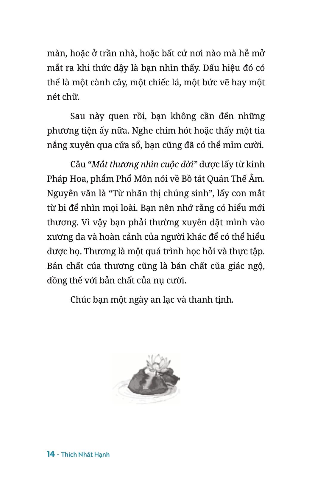 Từng Bước Nở Hoa Sen Không nhơ cũng không sạch Không bớt cũng không thêm Trí tuệ Ba La Mật Không có pháp nào trên Từng Bước Nở Hoa Sen Không nhơ cũng không sạch Không bớt cũng không thêm Trí tuệ Ba La Mật Không có pháp nào trên Sống là chuyển hóa không ngừng, tất cả mọi vật nương vào nhau để tồn tại. Thân tâm an trú trong chánh niệm thì khi đốt một lò trầm, tâm ta cũng thanh tịnh. Chấp nhận cuộc đời là chấp nhận cả sinh lẫn diệt, cả còn lẫn mất, cả vui lẫn buồn. Vì có sự sống là có chết chóc… có sum họp thì có chia lìa, có được thì sẽ mất đi… Đức Phật dạy rằng: "Cứu chữa cho tâm quan trọng hơn là cho thân, vì đó là nguyên nhân gây ra bao điều tội lỗi. Người có tâm từ bi rộng lớn và hành vi thiện lành, tâm sẽ ít bị vẩn đục bởi phiền não tham, sân, si chi phối. Nếu chúng ta mỗi ngày tỉnh giác từng ý nghĩ, lời nói và hành động của mình, thì ta sẽ biết cách làm chủ bản thân để ngày càng hoàn thiện chính mình hơn về mọi mặt." Từng bước nở hoa sen của Thiền sư Thích Nhất Hạnh là một trong những quyển sách "dạy" ta cách sống an nhiên như thế. Bốn mươi bảy bài kệ trong sách cũng là bốn mươi bảy bài học giúp ta tu tập chánh niệm mỗi ngày, hướng đến sự an lạc trong cả tâm, thân và sống hết mình cho từng giây phút hiện tại.
