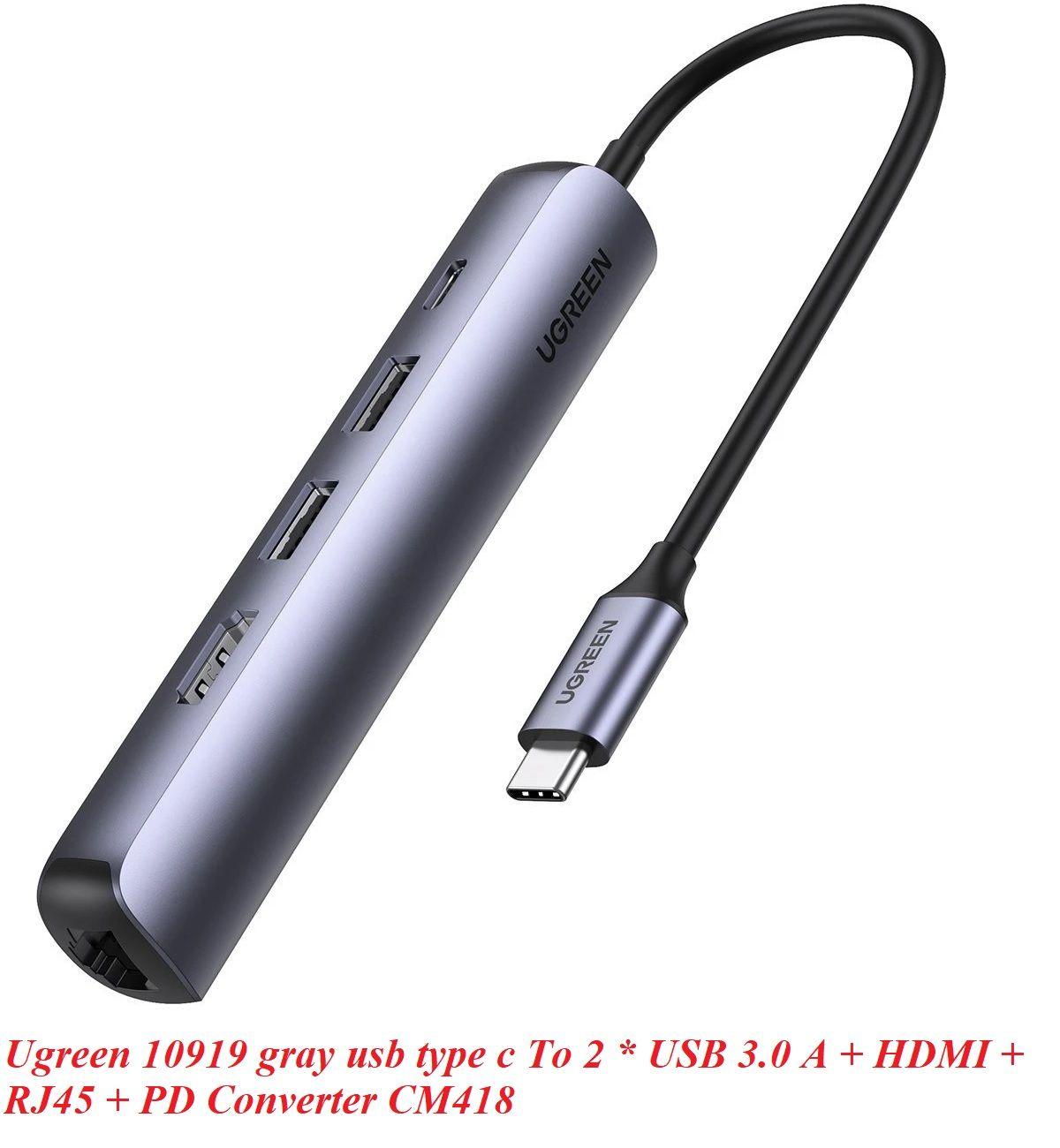 Ugreen 20010919 5 trong 1 màu xám Bộ chuyển type c To 2 * USB 3.0 A + HDMI + RJ45 + PD Converter CM418 10010919