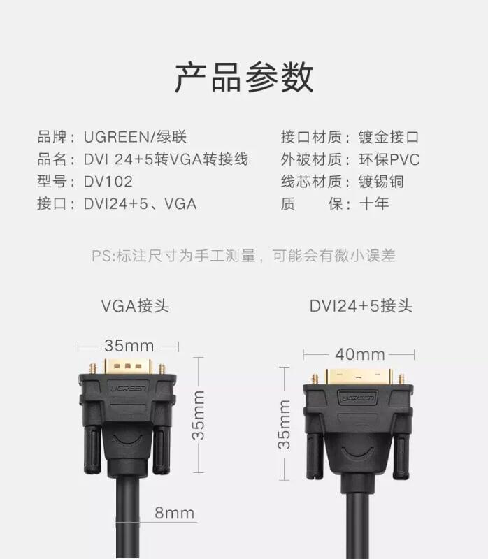 Ugreen 11618 Cáp chuyển đổi DVI 24+5dương sang VGA dương dài 3m DVI24+5 male to VGA male cable DV102 1. Length : 3M 2. Color : Black 3. Cable DVI24+5 male to VGA male 4.