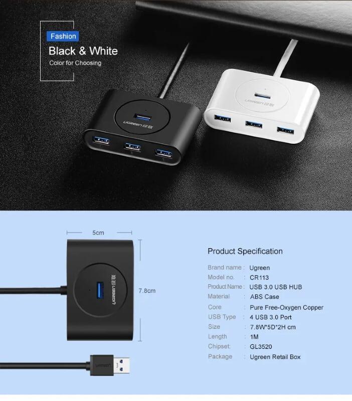 Ugreen 30202 1m usb 3.0 4 ports hub trắng cr118 1. Color : Trắng 2. Length : 1M 3. 180g 4. 15 x 15 x 5 cm