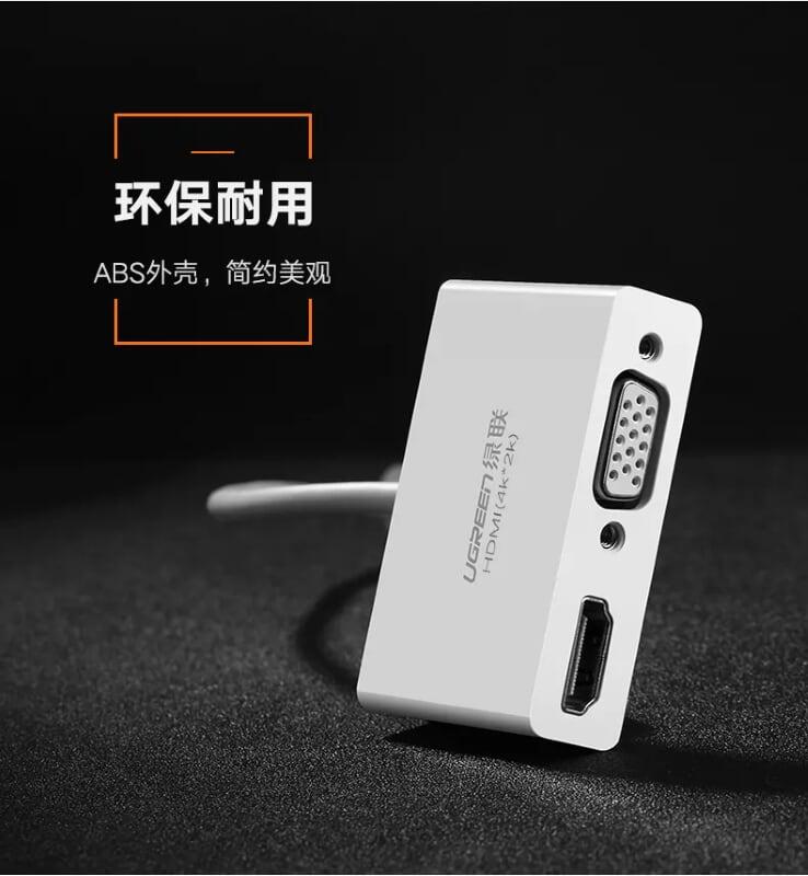 Ugreen 30843 15CM type c to hdmi vga trắng mm123 1. Features: Convert image and audio signals from USB-C to HDMI and VGA ports (VGA without Audio) 2. Cable length: 15cm 3. Color: White 4.